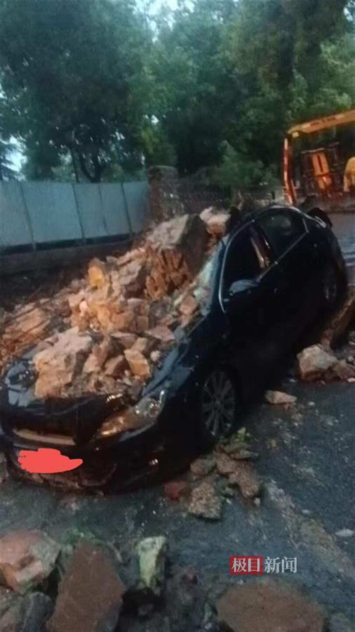 目击者王先生(化姓)告诉极目新闻记者,事发时当地正下着大暴雨,并且有大风,这辆江西牌照的小轿车路过时看见路中间倒了一棵树准备掉头,此时路边一侧的一段院墙突然倒塌,倒塌的砖石飞落到车上,导致车辆受损。