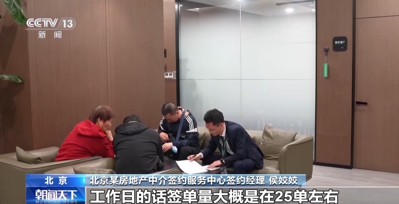 北京某房地产中介签约服务中心签约经理 侯姣姣:签约室就一直都有人在用,基本上是没有空着的时候,工作日的话签单量是在25单左右,周末的话可能会更多一些。