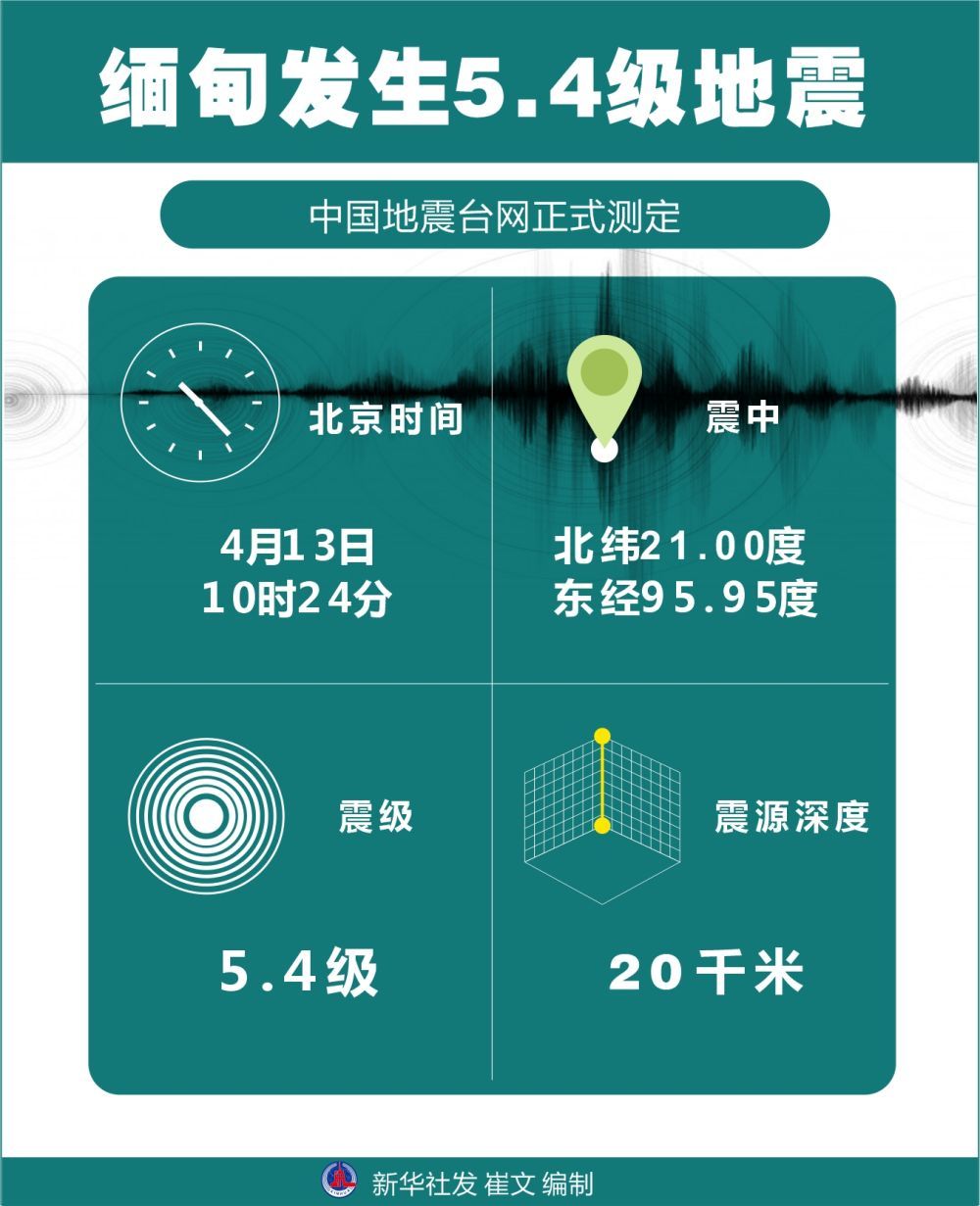中国地震台网正式测定:4月13日10时24分在缅甸(北纬21.00度,东经95.95度)发生5.4级地震,震源深度20千米。