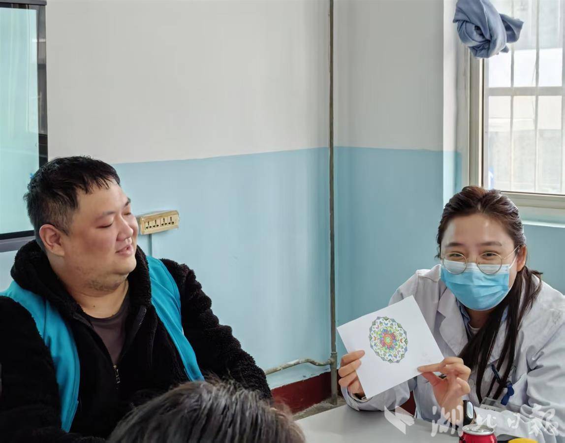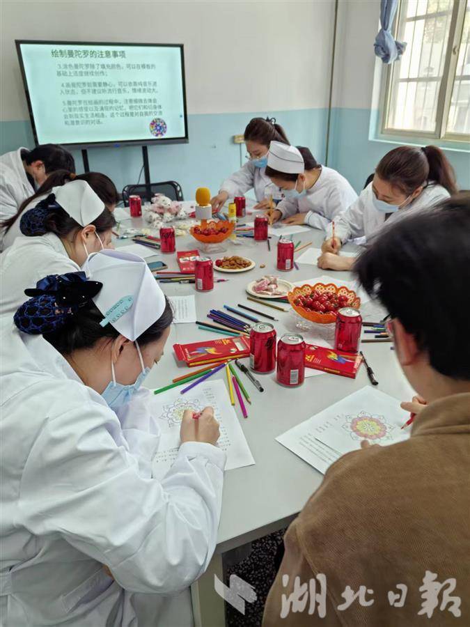 王超是武汉科技大学附属天佑医院驻岗医务社工。前不久,他刚刚完成对精神科医护人员定期的团体绘画疗愈。他介绍,精神科医护人员治疗的病人多是封闭管理,治疗周期往往比其他科室长,承担压力更大。在轻松愉快的氛围中,医护人员绘制曼陀罗花,画完后解释“为什么这么画”,各抒己见,互相点评,一个小时过去,大家举着自己的作品合影,笑着问“下次活动什么时候安排”。