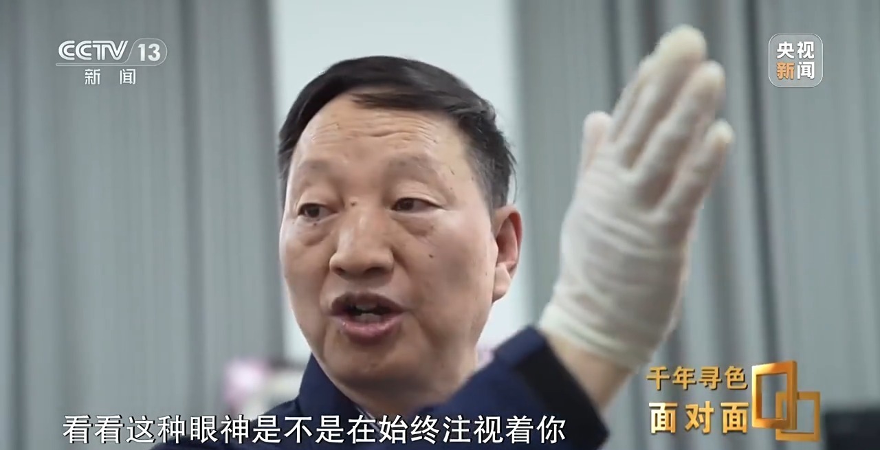 兰德省:你看它的眼神,180度,从左往右跟着走一遍,它的眼神始终注视着你。所以说,秦代的工匠知道人体解剖学,他把人体三庭五眼,三庭,从上到下三等分,它的比例比较协调。
