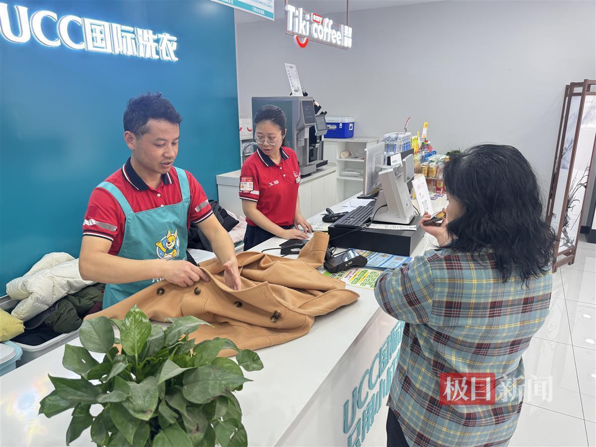 与此同时,家住附近的刘阿姨抱着一袋需要干洗的毛呢大衣走进了洗衣店,黄师傅及其他两位员工迅速切换专业态度,微笑着将客户迎进店内,为她介绍着服务项目及办卡优惠。刘阿姨表示,自己原本是要去别处,但在公园散步时听其他老伙伴们推荐说玉带门加油站这里的洗衣服务很好,于是她决定来试一试。