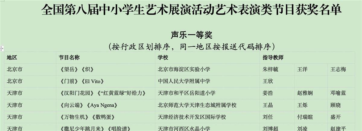全国第八届中小学生艺术展演活动艺术表演类节目获奖名单