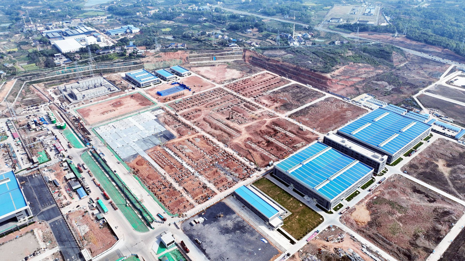 邦普时代45万吨新一代磷酸铁锂项目施工现场。