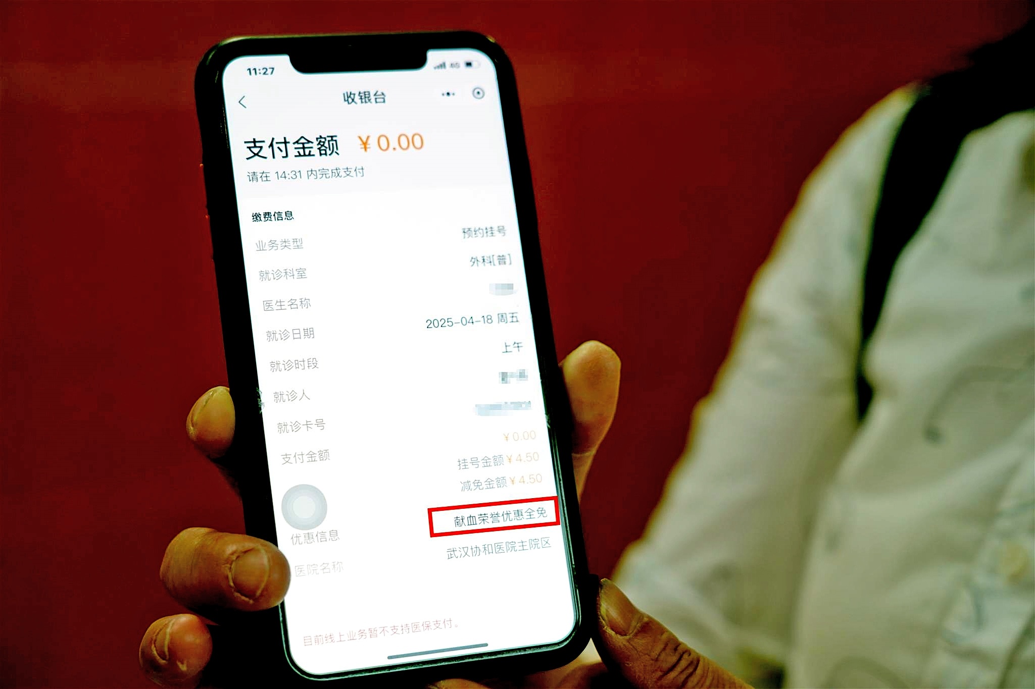 “挂号页面已经显示费用减免,点击完成‘缴费0元’的操作后,还会有‘献血荣誉优惠全免’的字样。”4月17日上午,累计献血265次的市民夏伟燕在协和医院门诊大厅体验了一把免挂号费的全流程。在手机小程序上,她的普通门诊号费用自动减免,扫码候诊时,队列自动排在预约时段的靠前位置。