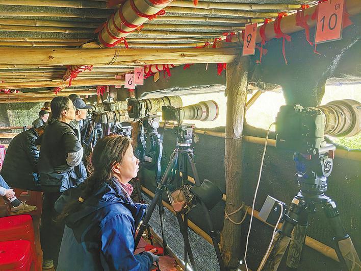 爱鸟人士藏在观鸟棚拍鸟。(湖北日报全媒记者 汪训前 摄)