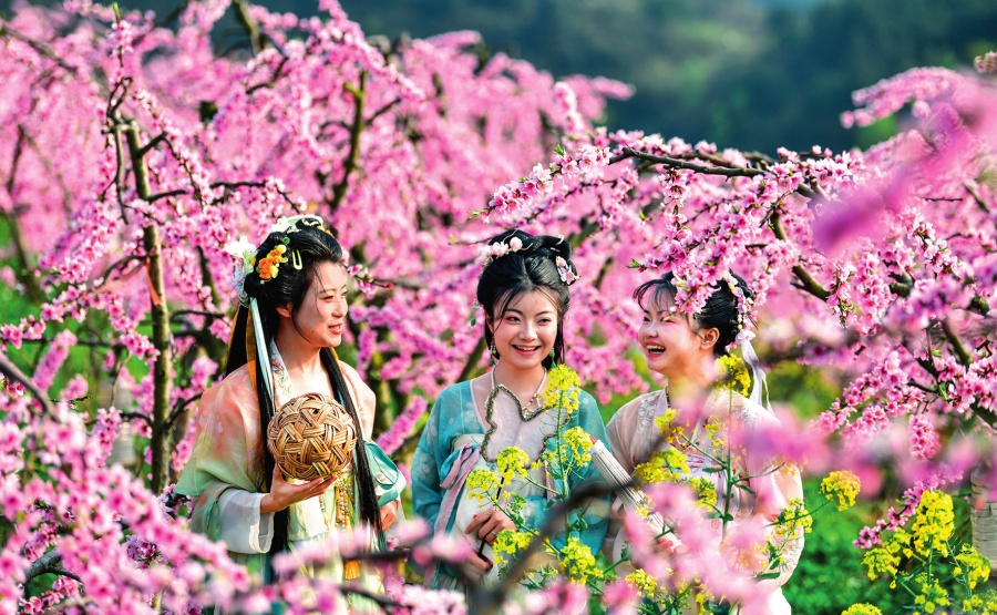 汉服爱好者在贵州省贵定县德新镇新铺村黄桃种植基地游玩(2025 年 4 月1 日摄) 杨文斌摄 / 本刊