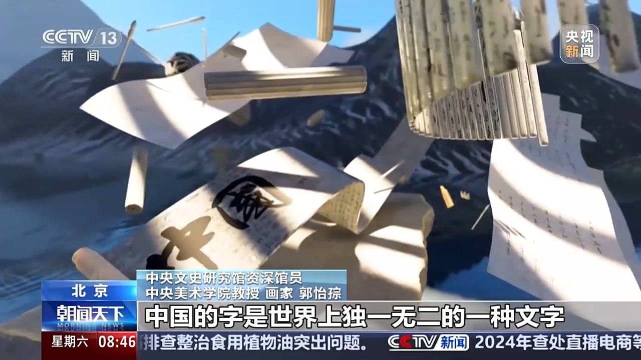 中央文史研究馆资深馆员 中央美术学院教授 画家 郭怡孮:中国画和文字向来都是书画同源,中国的字是世界上独一无二的文字,它的创造又有形音,又有形意又有图像,有好多文字是从图开始的,所以结构是非常美的,它既是一种精神信息的传达,又是一种文化信息的传达。