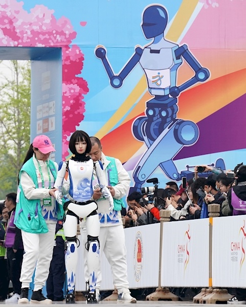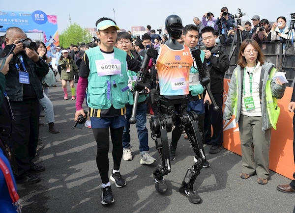 4月19日,全球首次“人机共跑”半程马拉松在北京亦庄开跑,20支人形机器人队伍和人类选手同时出发。最终,天工队选手天工Ultra以2小时40分42秒的成绩夺冠。新华社发