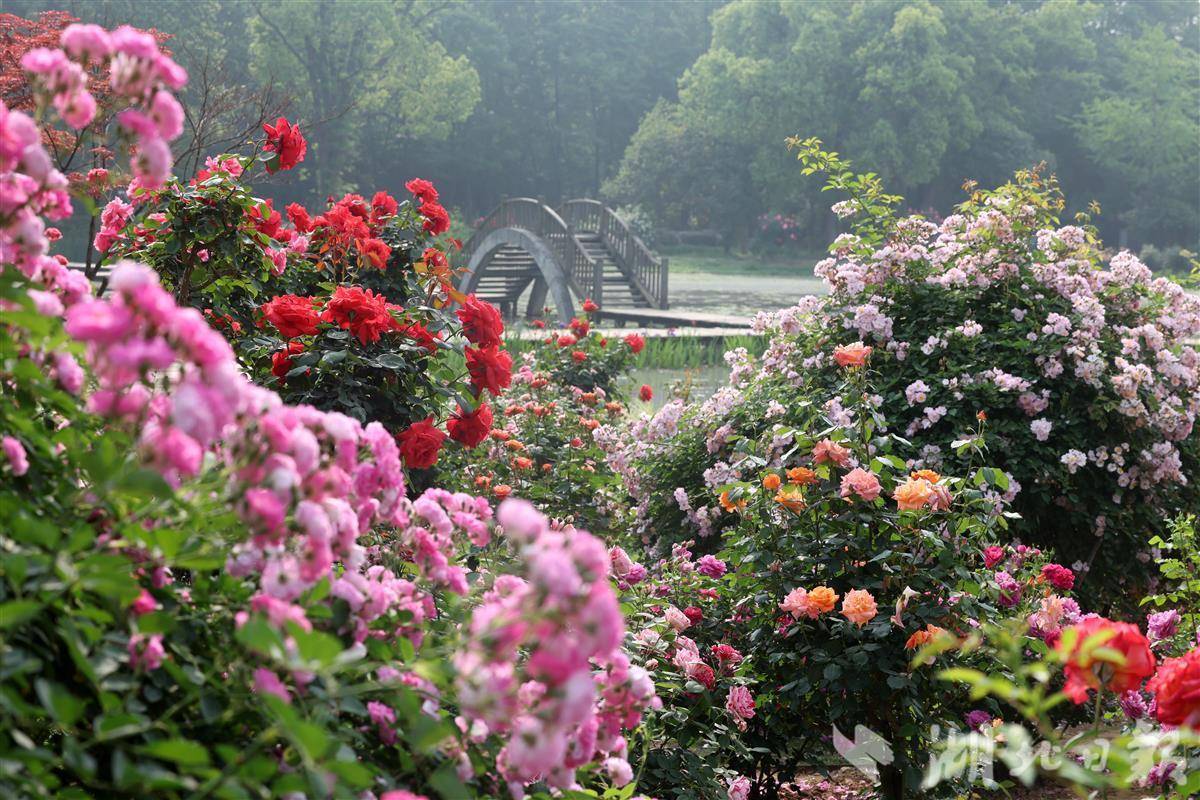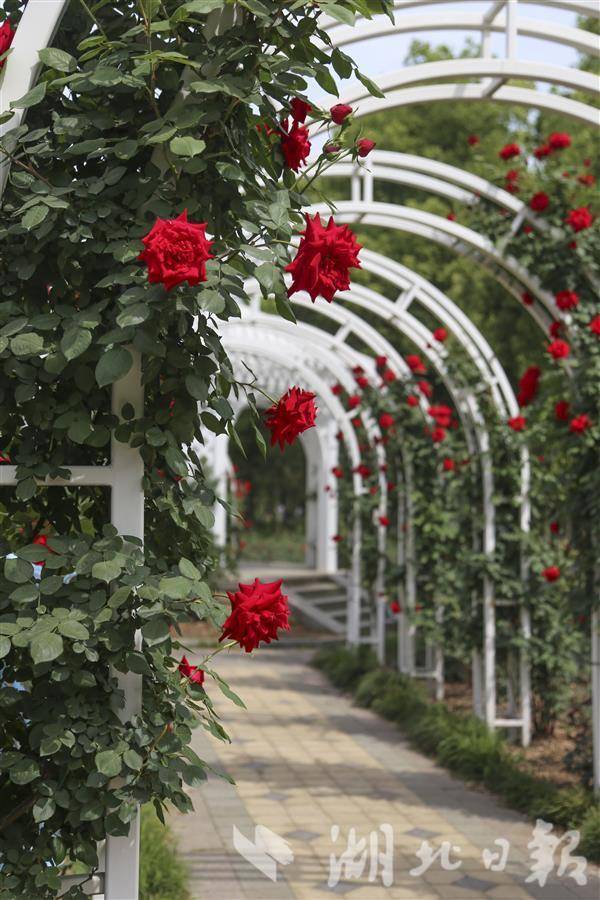 一进入4月中下旬,月季就成为武汉春天的绝对主角。武汉植物园内,藤蔓攀援、花枝舒展,为武汉春日谱写着最炽热的尾声乐章。步入月季园,绯红的花瓣如绸缎般层叠舒展,清新的花蕊点缀其间。