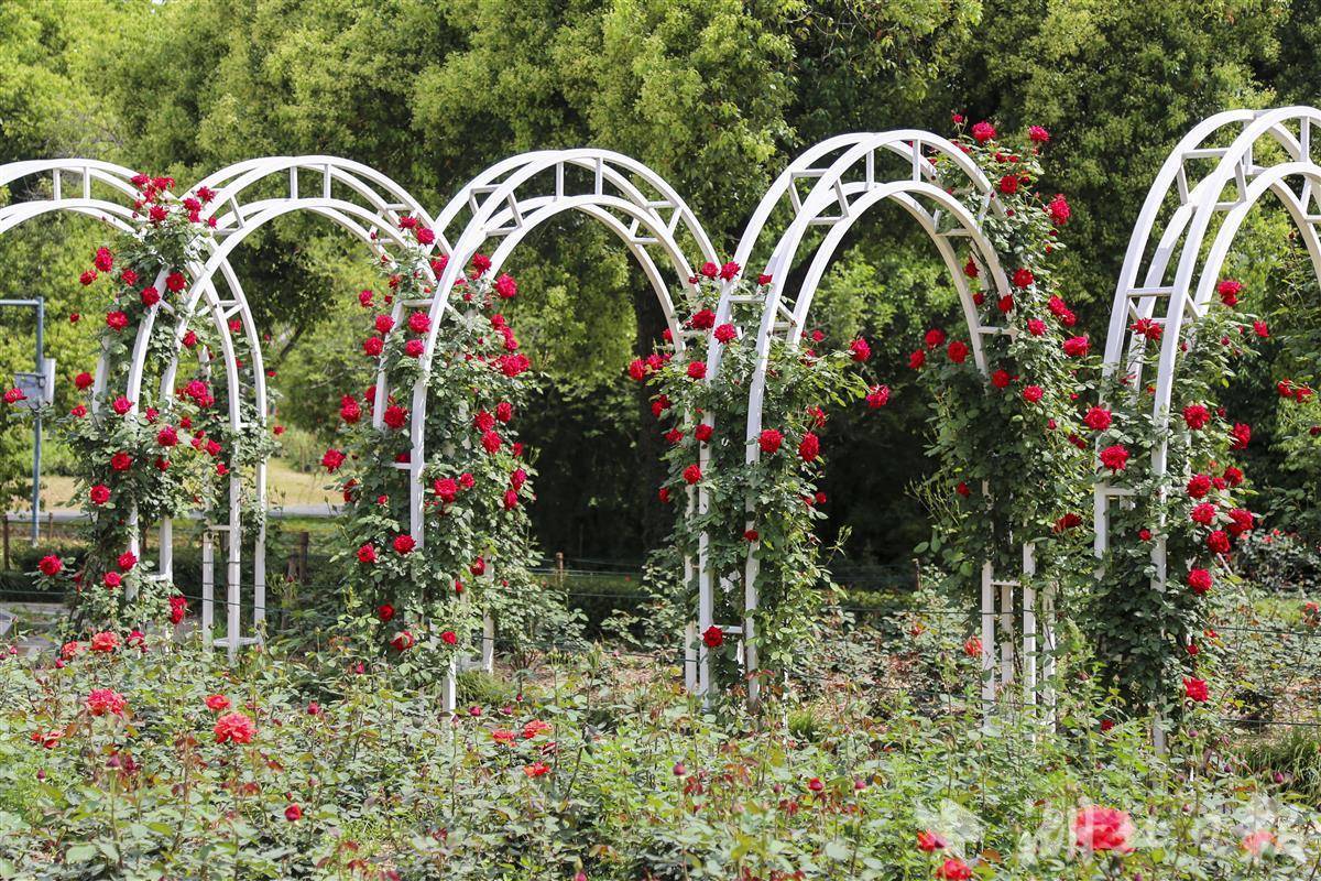 武汉园博园长江文明馆西侧的一面蔷薇花墙,开成瀑布的花朵随风摇曳。武汉世贸希尔顿酒店对面和转角处,也有片2米高的蔷薇花瀑布,触手可及。武汉江滩外戗台和江滩内也有玫红色蔷薇,五一节前一直处于最佳观赏期。