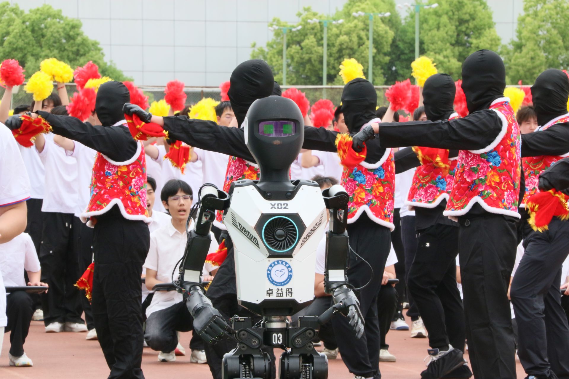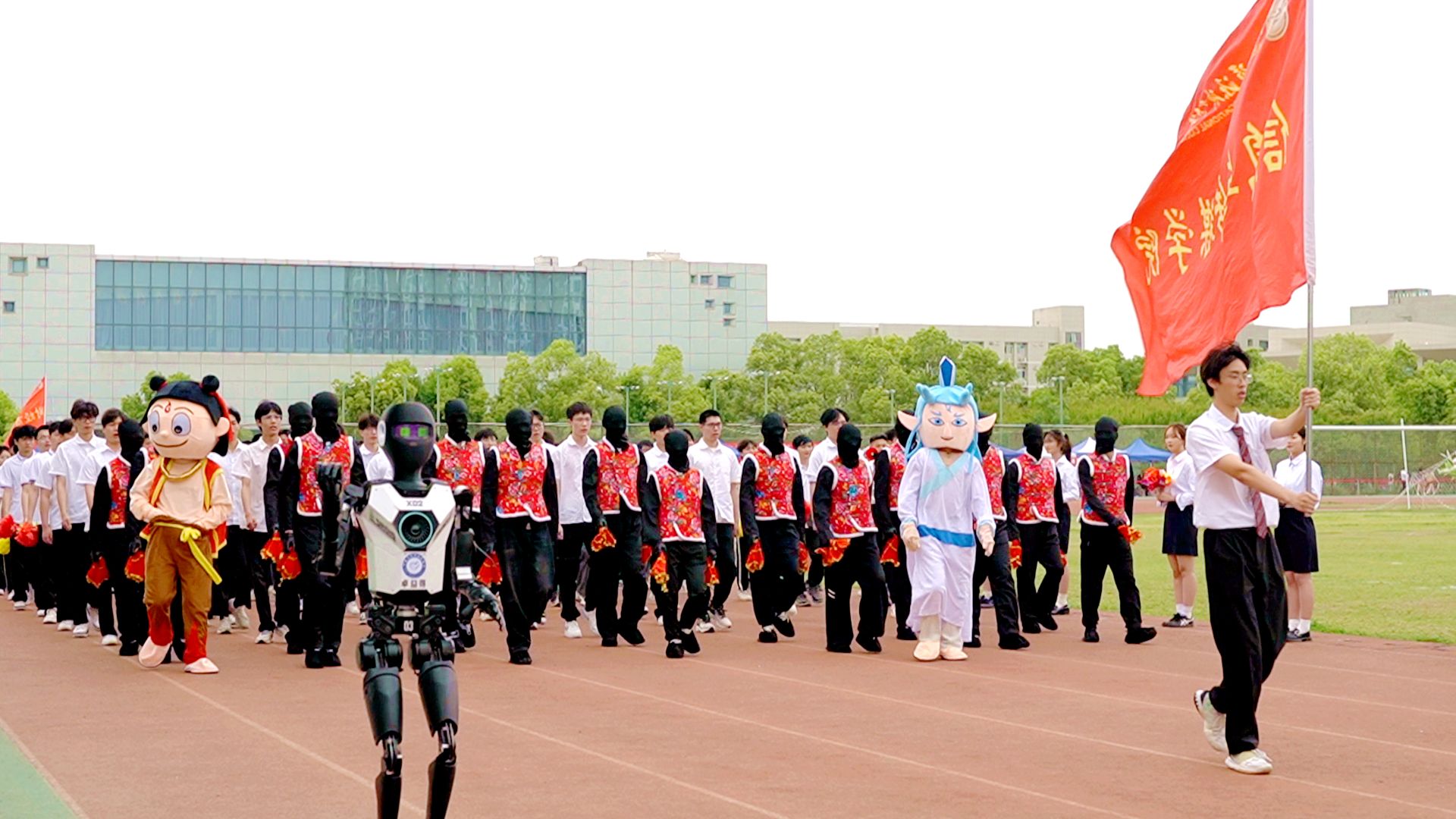 荆楚网(湖北日报网)讯(通讯员徐海东 刘开宇)近日,湖北国土资源职业学院春季运动会开幕式上演“未来科技秀”,人型机器人“X02”领衔的智能方阵成为全场焦点。身着赛博花袄的学生方阵簇拥着机器人,与哪吒、敖丙等元宇宙IP角色跨次元同台互动,在运动场上划出一道科技+文化的靓丽风景线。
