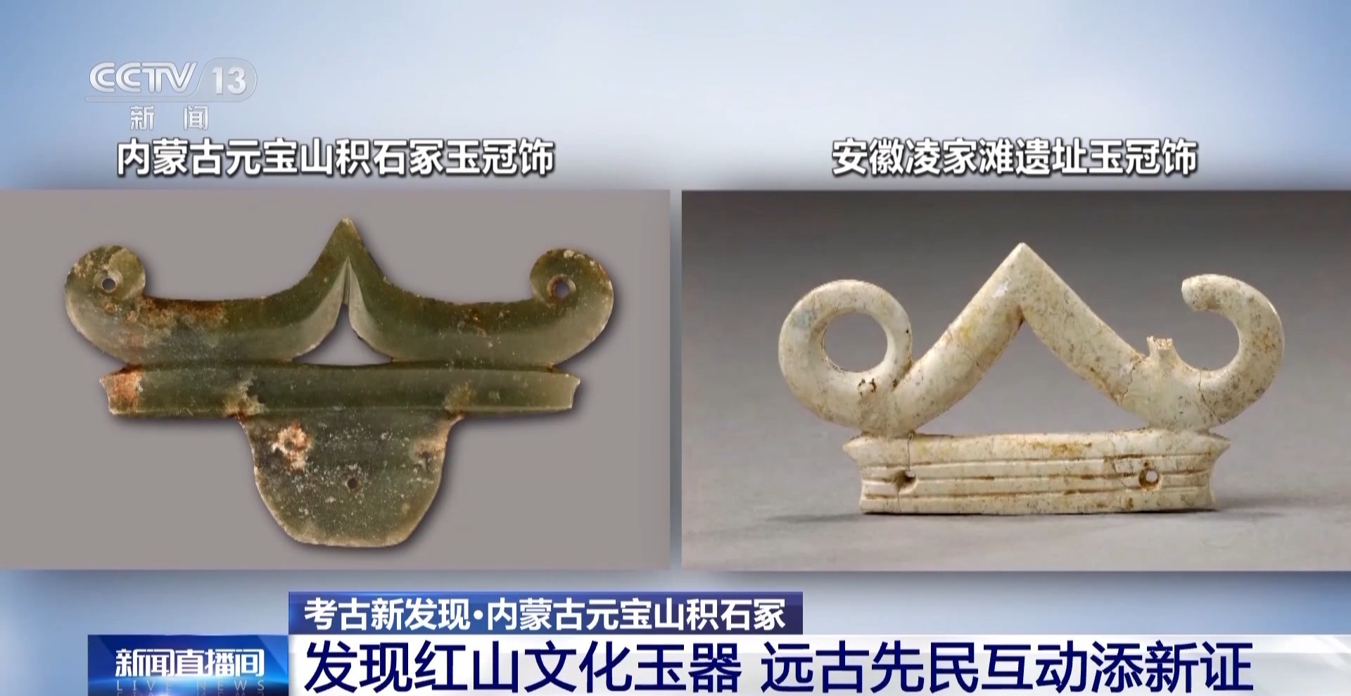内蒙古自治区文物考古研究院研究馆员 党郁:这个玉冠饰跟凌家滩文化那个简直是如出一辙,造型非常相似。所以一直说,红山文化与凌家滩文化之间有远距离的交流,是技术上的交流、文化上的交流,甚至是人群上的交流,随着考古发现,这种发现越来越多。