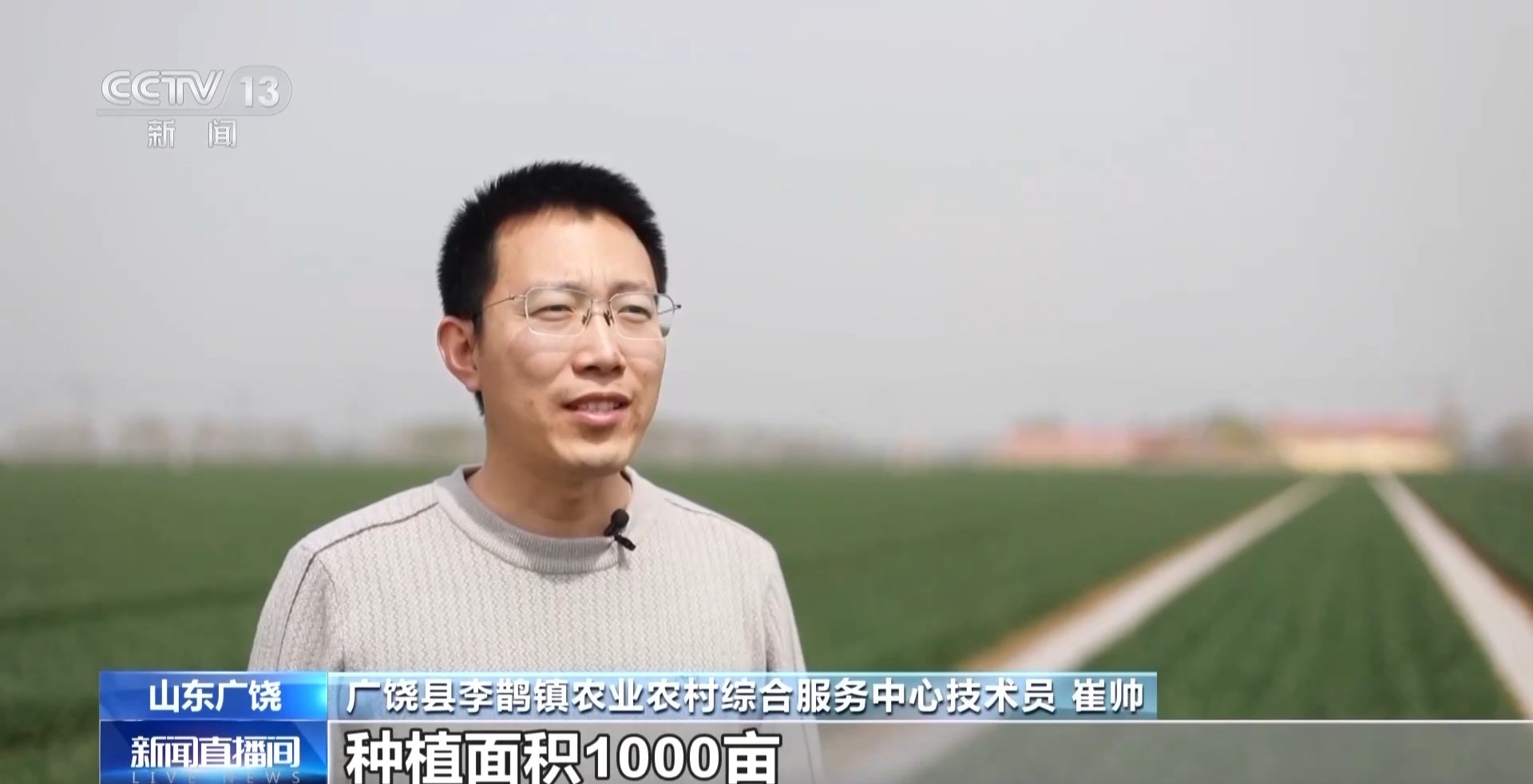 广饶县李鹊镇农业农村综合服务中心技术员 崔帅:今年我们李鹊镇种植面积1000亩,这种种植模式,对粮食亩产量具有明显提升。