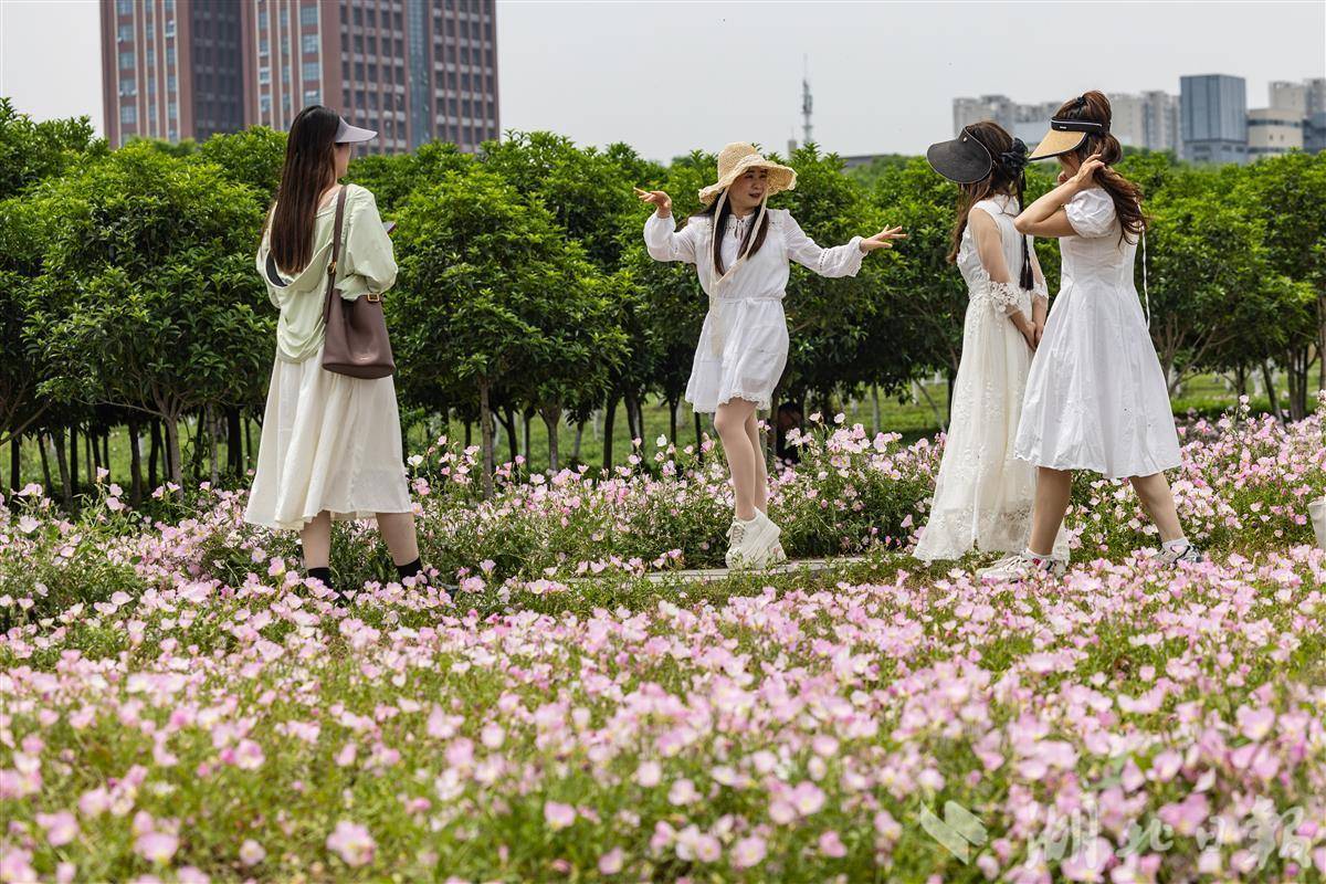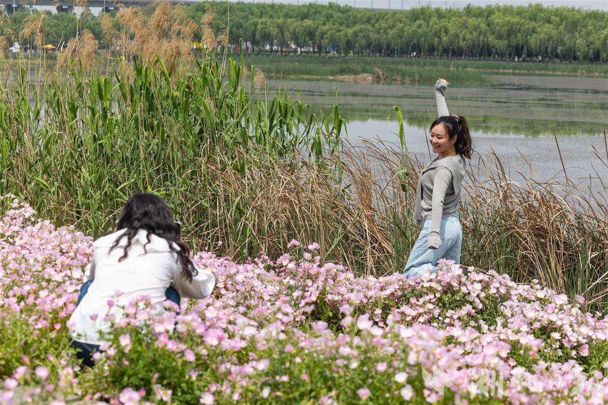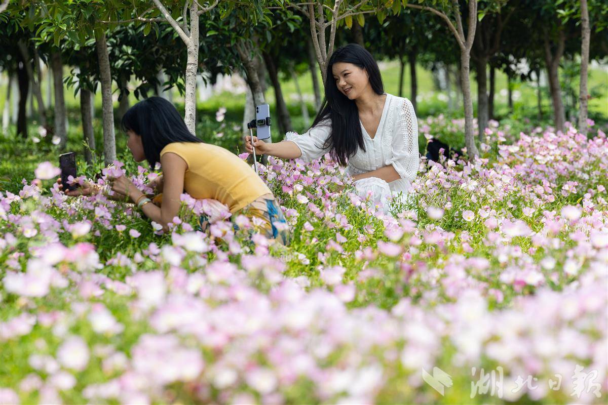2025年4月23日,市民游客在粉色的月见草花海中游玩拍照。近日,武汉市东西湖区黄塘湖公园2万多平方米的月见草迎来盛放期,粉白色花朵层层叠叠、连绵成片、铺展成毯,置身花海仿佛进入了一幅油画。(湖北日报全媒记者 倪娜 摄)
