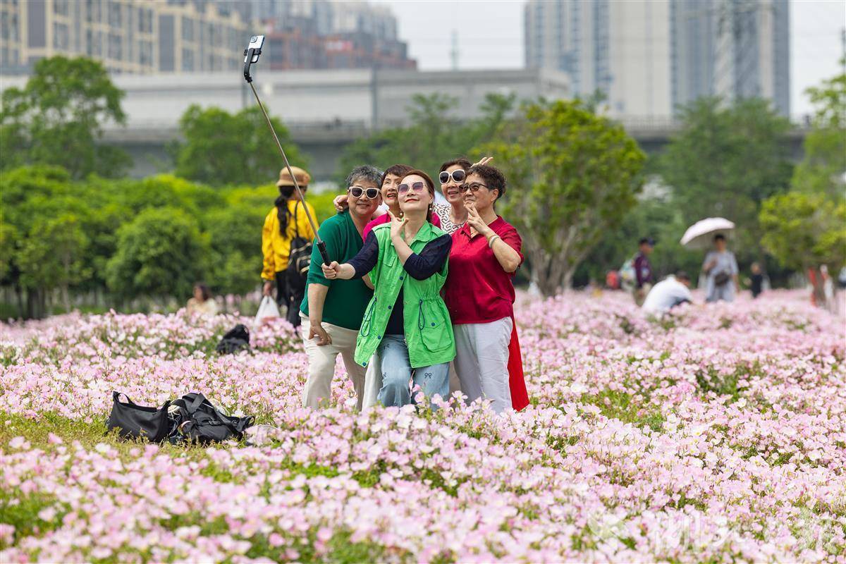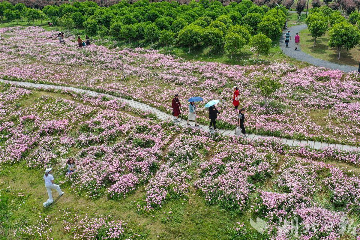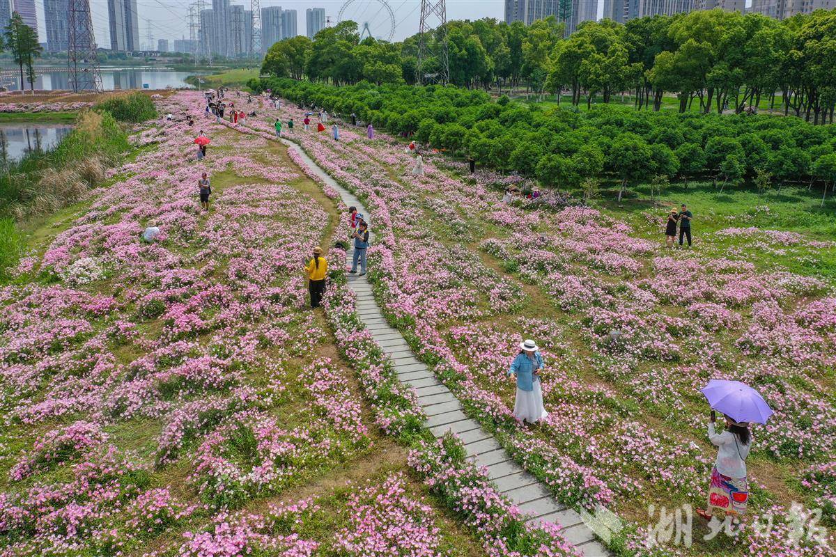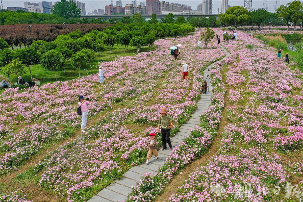 2025年4月23日,市民游客在粉色的月见草花海中游玩拍照。近日,武汉市东西湖区黄塘湖公园2万多平方米的月见草迎来盛放期,粉白色花朵层层叠叠、连绵成片、铺展成毯,置身花海仿佛进入了一幅油画。(湖北日报全媒记者 倪娜 摄)