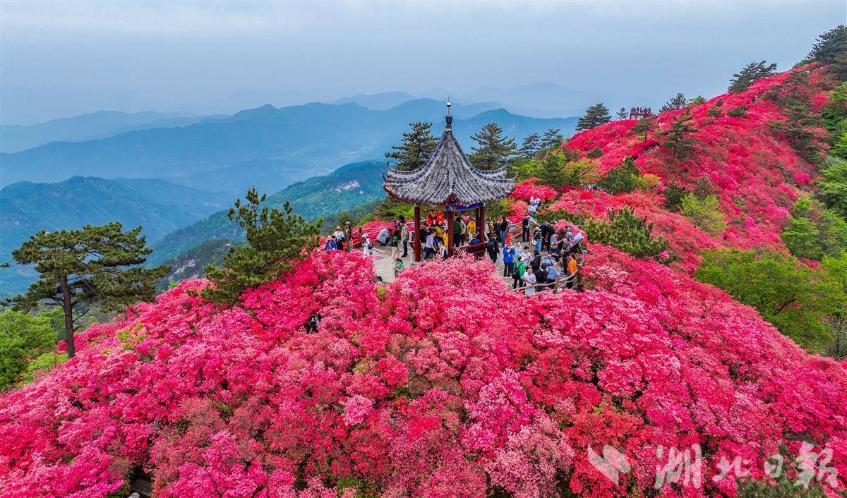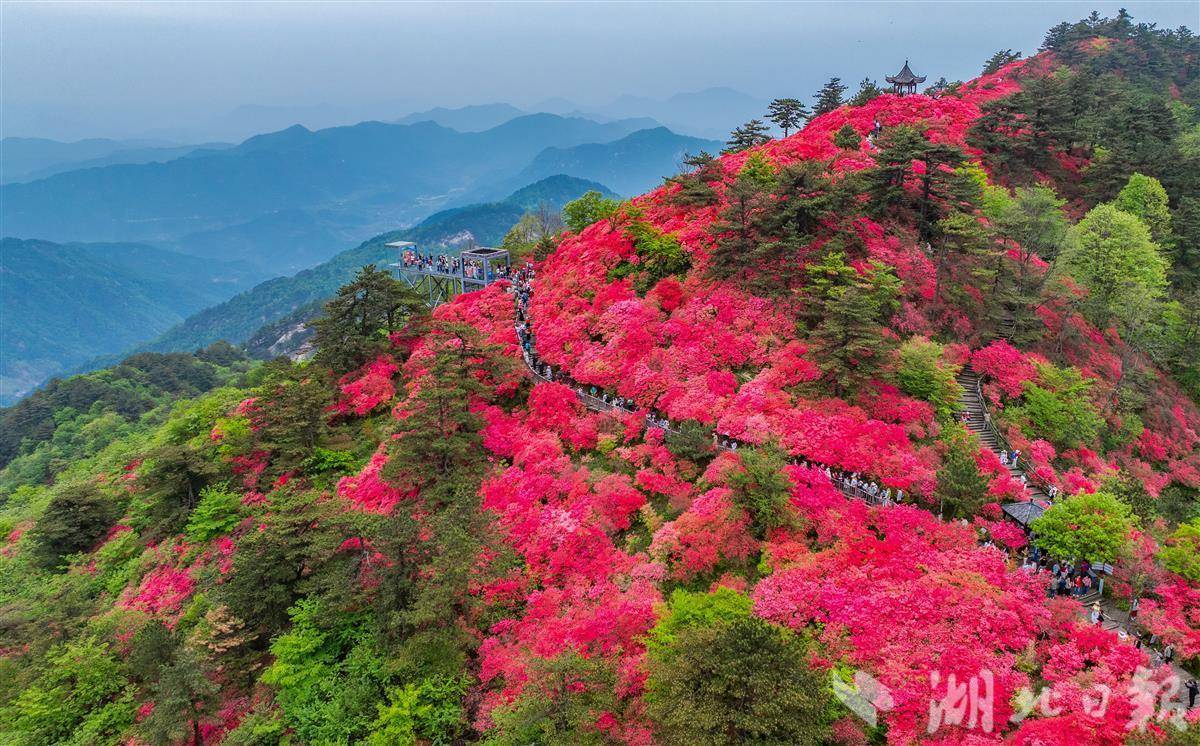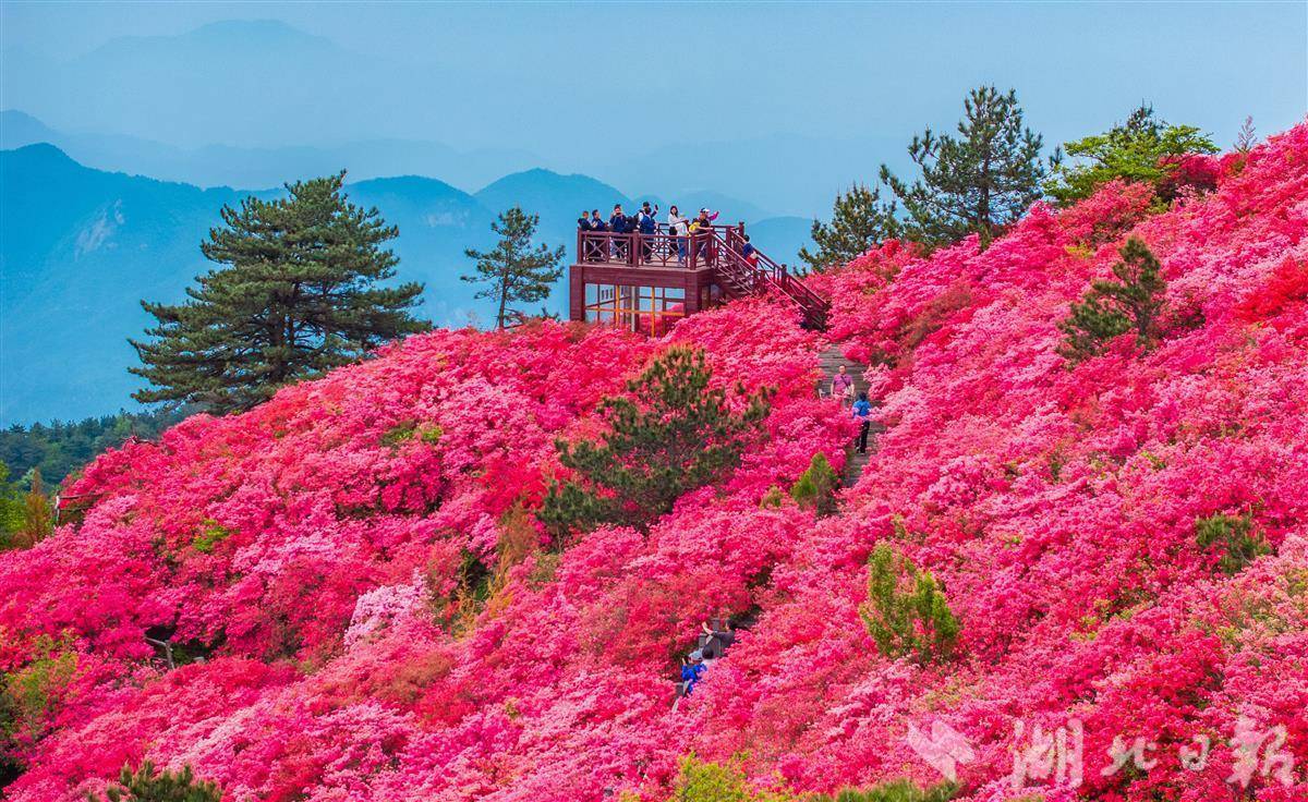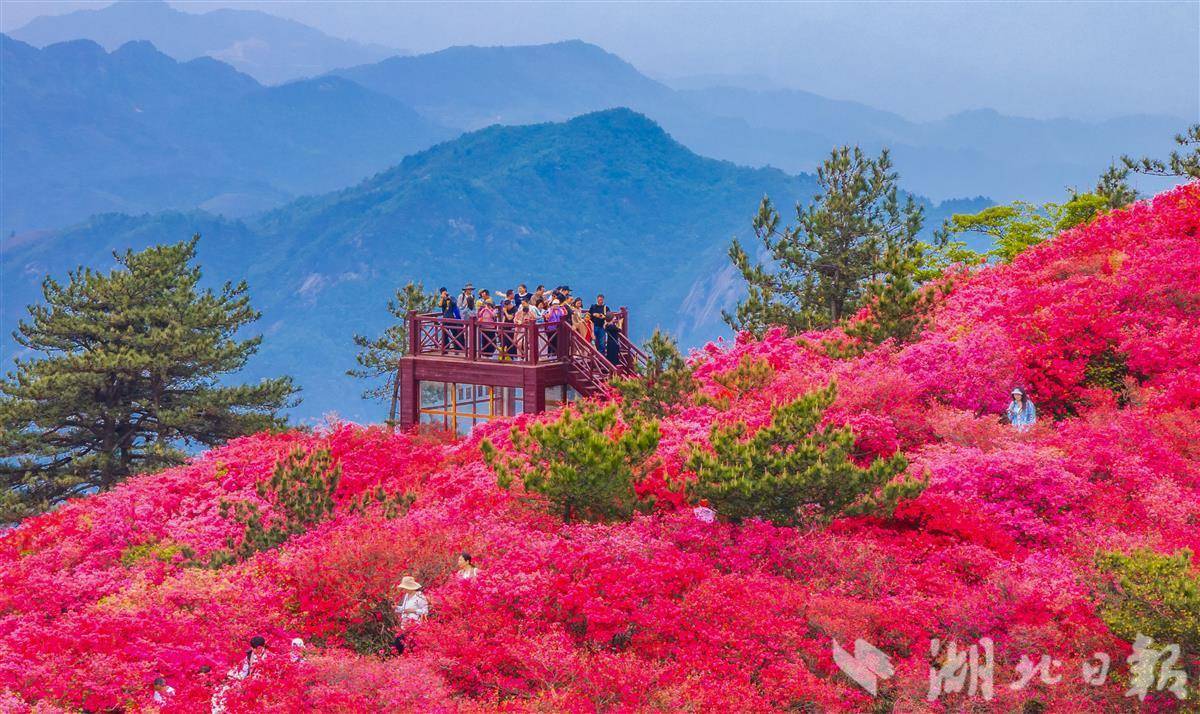 4月24日,麻城市龟峰山景区,十万亩野生杜鹃花迎来盛花期,吸引全国各地赏花客游玩打卡。龟峰山景区天然古杜鹃群落平均树龄在百年以上,每年春季,集中连片的杜鹃花海绽放,蔚为壮观。今年自进入赏花旺季以来,龟峰山景区日均客流量达1.5万人。(湖北日报全媒记者 薛婷 通讯员 陈珏 秦楣 摄)