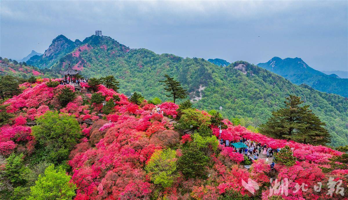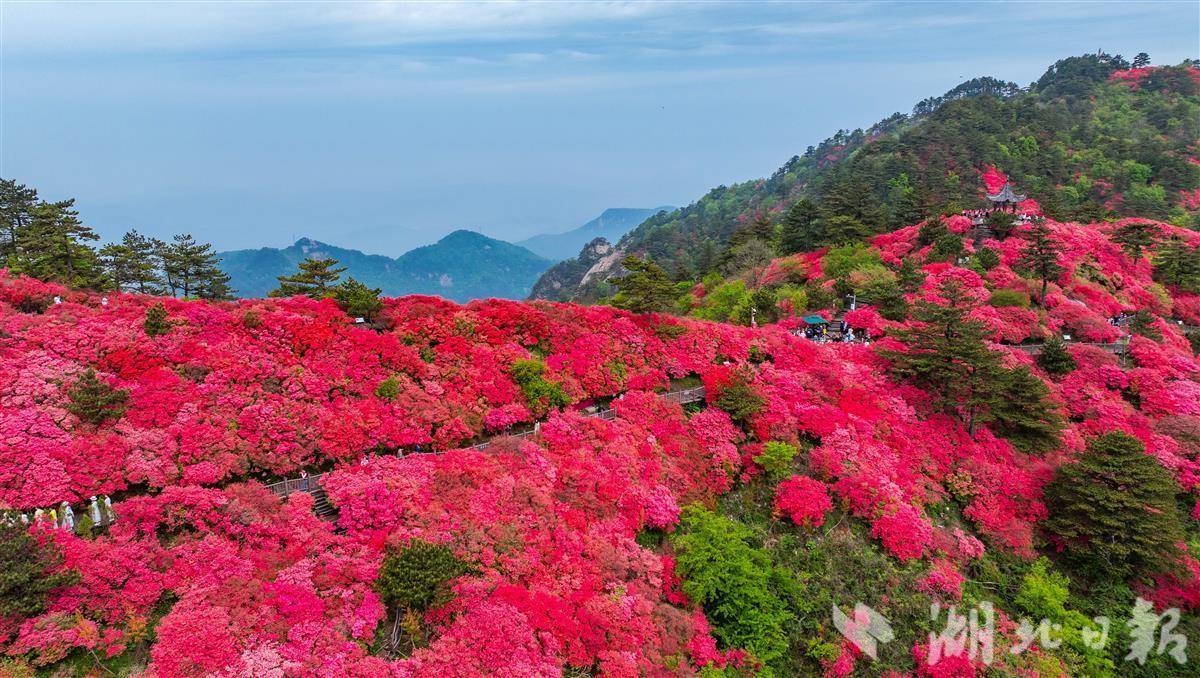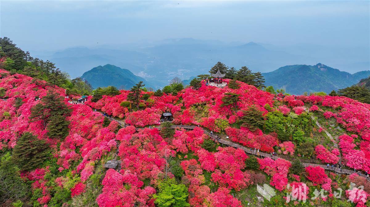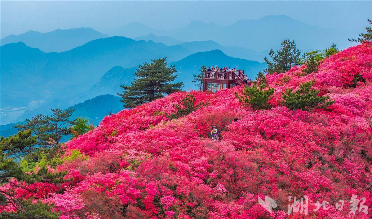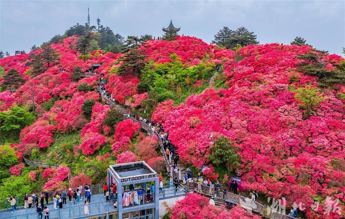 4月24日,麻城市龟峰山景区,十万亩野生杜鹃花迎来盛花期,吸引全国各地赏花客游玩打卡。龟峰山景区天然古杜鹃群落平均树龄在百年以上,每年春季,集中连片的杜鹃花海绽放,蔚为壮观。今年自进入赏花旺季以来,龟峰山景区日均客流量达1.5万人。(湖北日报全媒记者 薛婷 通讯员 陈珏 秦楣 摄)