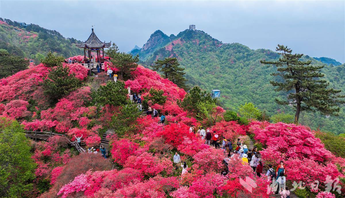 4月24日,麻城市龟峰山景区,十万亩野生杜鹃花迎来盛花期,吸引全国各地赏花客游玩打卡。