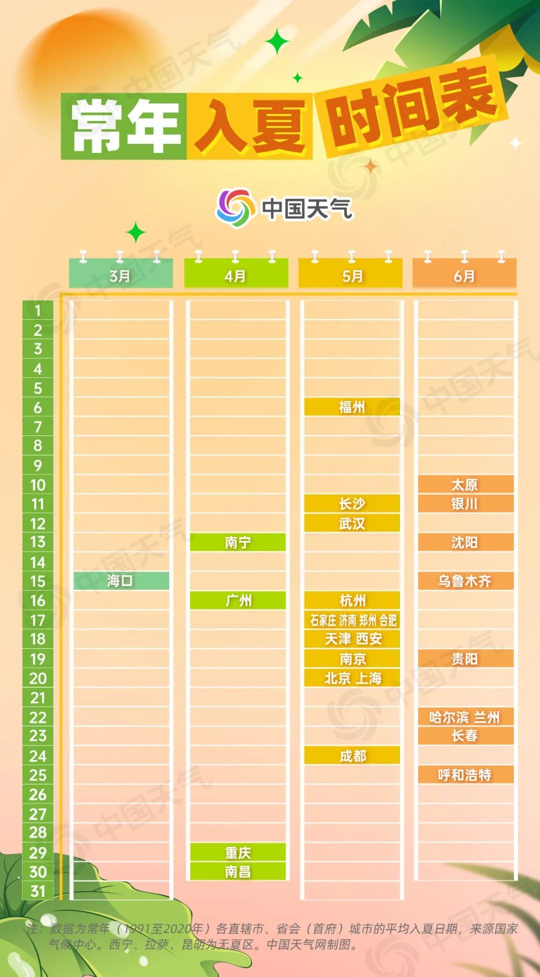 截至4月22日,海南岛、云南南部、广西、广东大部、福建东南部、湖南南部和东部、江西中南部、湖北东南部、四川南部和东部等地已进入气象学意义上的夏季。