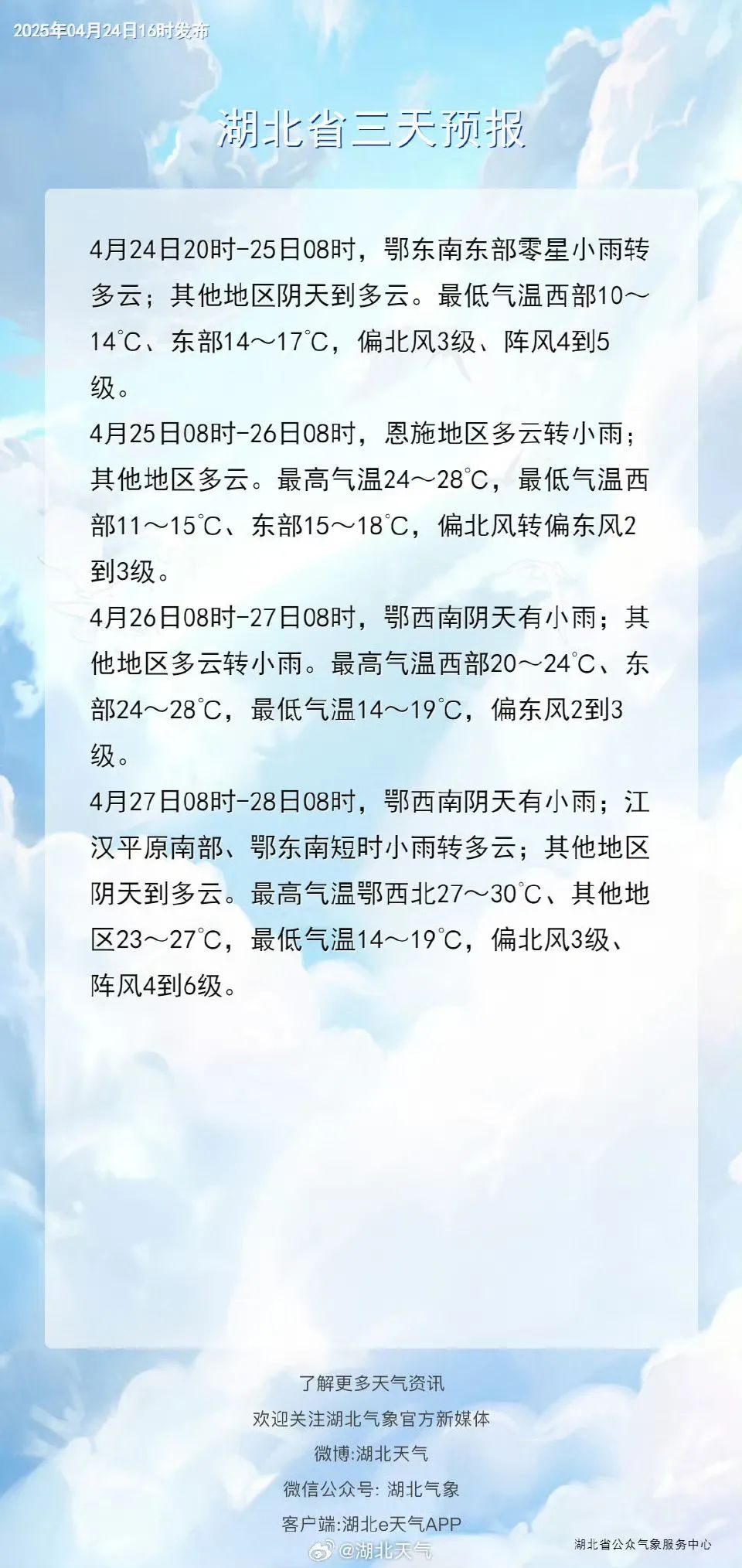 预计今天湖北北部部分地区为阴天到多云的天气,省内其他地区会出现小雨,受新一股冷空气影响,省内气温会有所下降,最高气温降至21~26℃,同时北风加强,阵风可达5到7级。明天,大部地区为多云天气,仅恩施地区会出现小雨。气温有所上升,大部地区最高气温升至24~28℃。后天,我省南部以及东部地区又会有小雨出现,西部地区最高气温降至20~24℃。