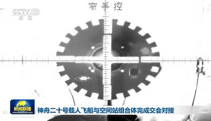 神舟二十号载人飞船入轨后,经过6次远距离导引自主轨道控制,与中国空间站建立相对导航。在200米、19米等保持点飞船完成姿态调整,地面各系统确认状态后,缓慢向天和核心舱径向对接口靠拢。