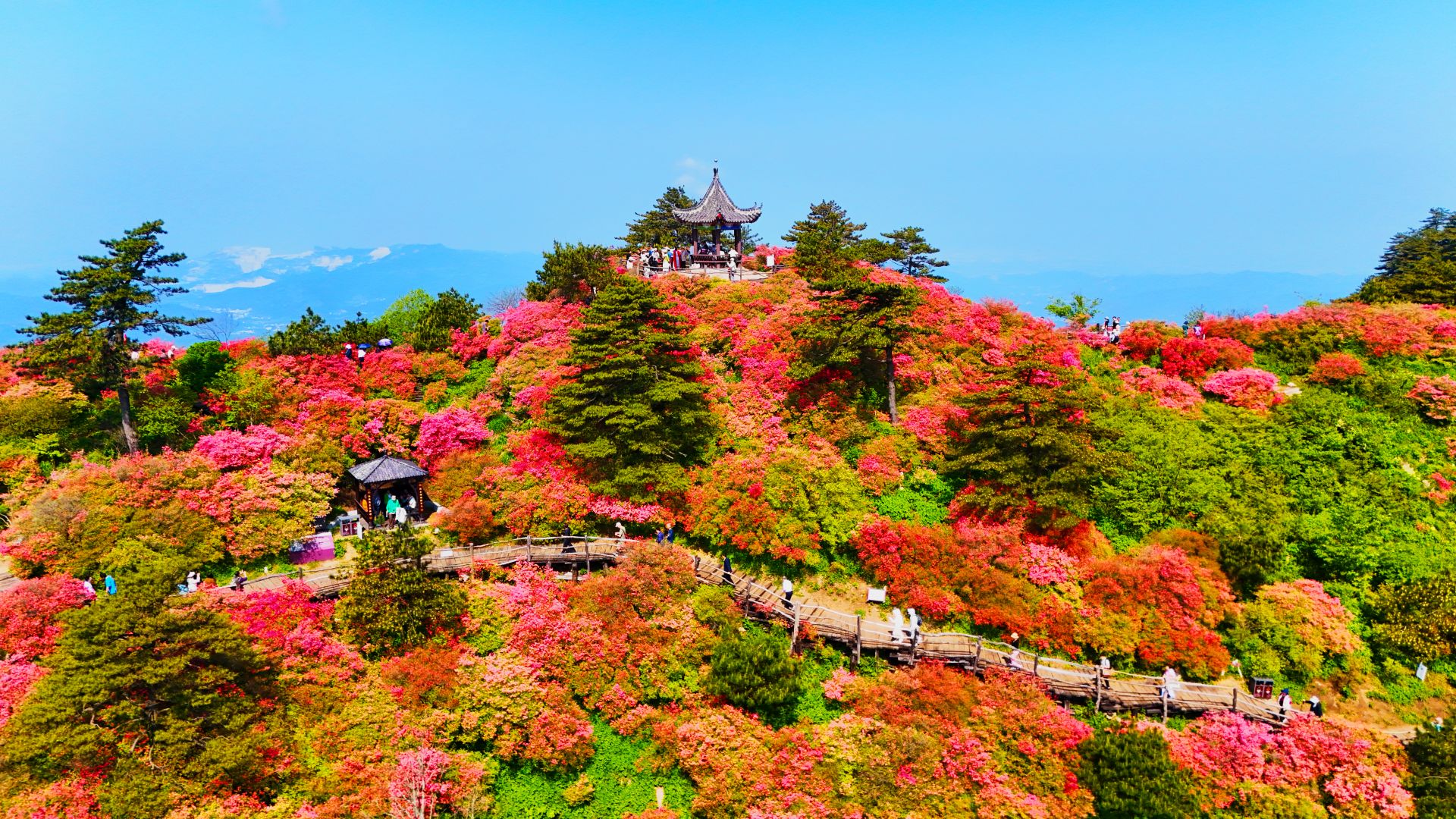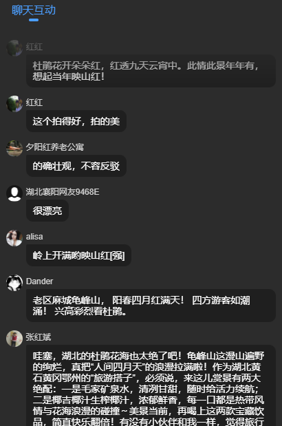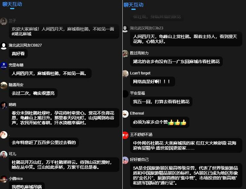 镜头中,龟山核心景点被红粉交织的杜鹃 “红霞” 全覆盖,艳若丹霞的花瓣随风轻颤,网友直呼“美到窒息”。这场直播吸引了超68万人观看,点赞数超万人,弹幕区被“龟峰山杜鹃,100%值得一看,这才是真正的旅游圣地!”“五一必须去打卡”刷屏。主播和景区讲解员阮导沿着花海二环线边走边聊,当镜头扫过“杜鹃花海一环线”时,航拍画面下,花浪如红色瀑布倾泻山间,网友赞叹:“这景色真的是太美啦!”还有不少外地网友线上作诗,表达对杜鹃花的赞美之情。