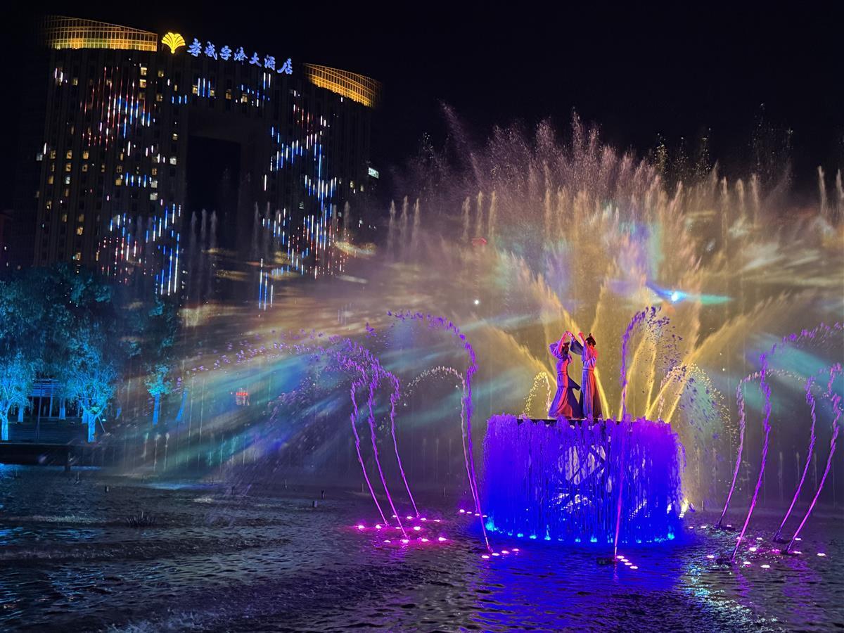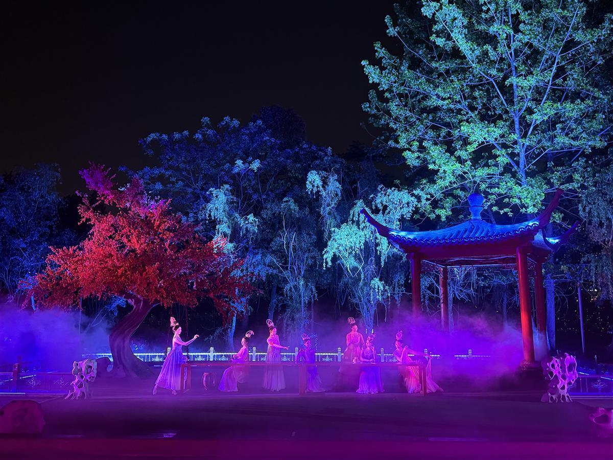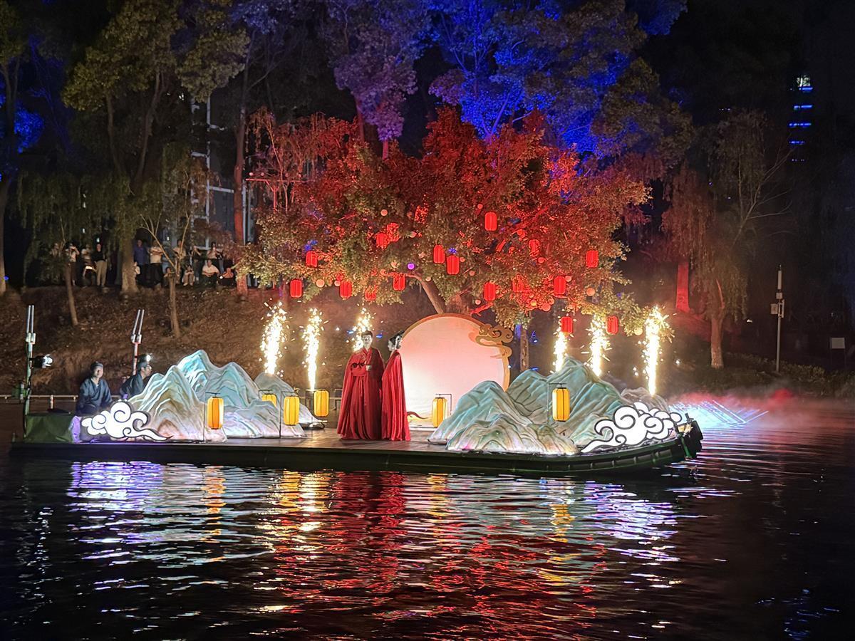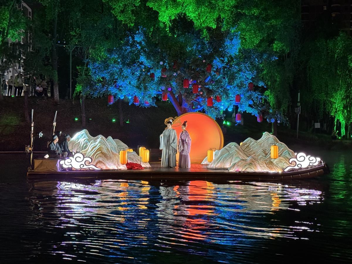 《鹊桥》《同心》《飞天》……轻舟缓行,景随船移,一幕幕场景层层递进,置身波光粼粼的槐荫河上,“天界-人间-仙境”三重时空交织,4.5公里河岸旖旎风光与尖端科技交相辉映,东方爱情史诗活在了眼前。
