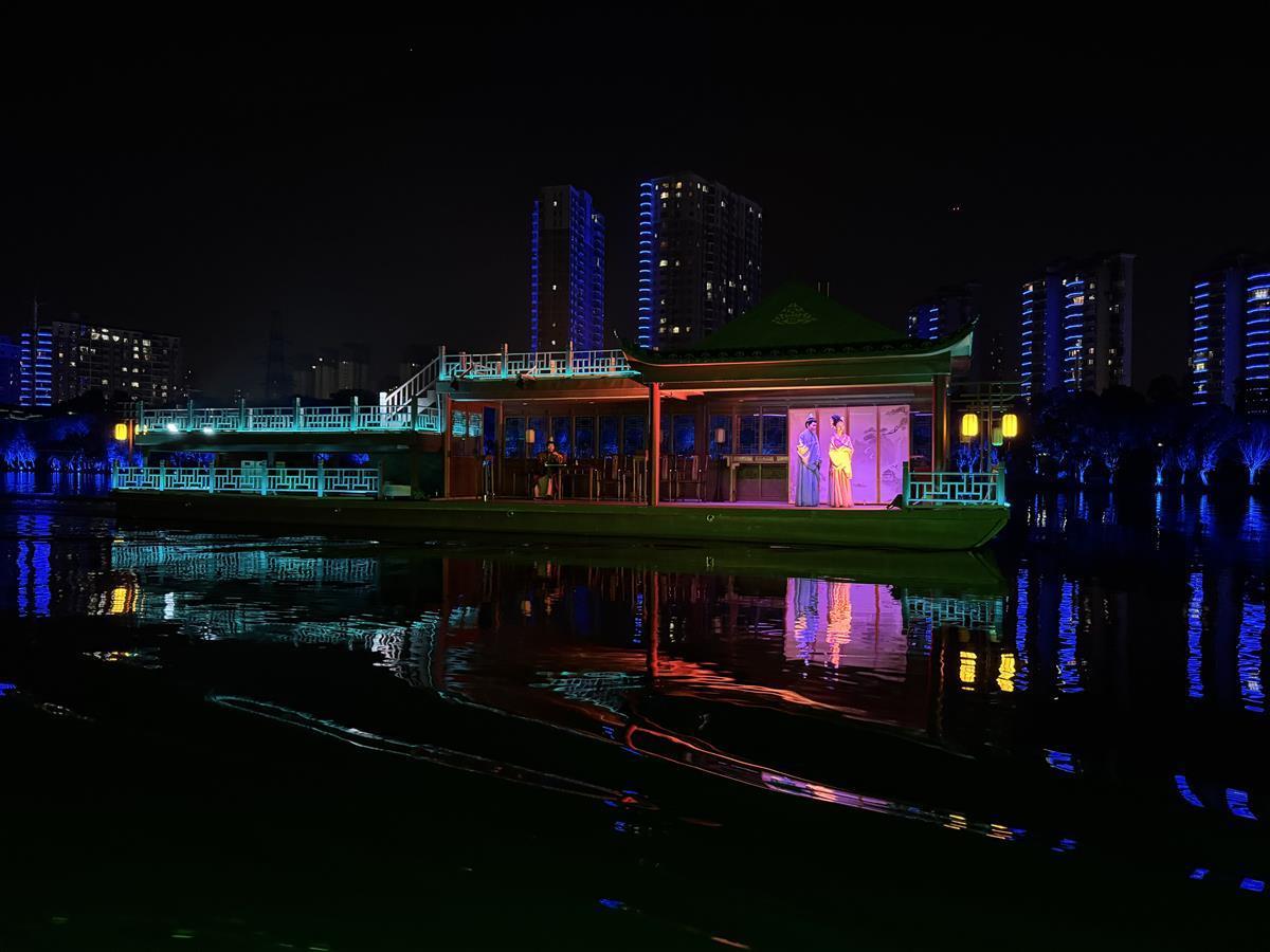 当晚,槐荫河畔星光与灯火交织成诗。随着一声船笛划破夜空,华中首部大型行浸式水上夜游演出《槐荫船说》正式启幕。这场以国家级非遗“董永传说”为魂、科技为翼的视听盛宴,将千年孝爱文化与前沿光影艺术熔铸一体,为观众开启了一场跨越时空的仙凡恋歌。