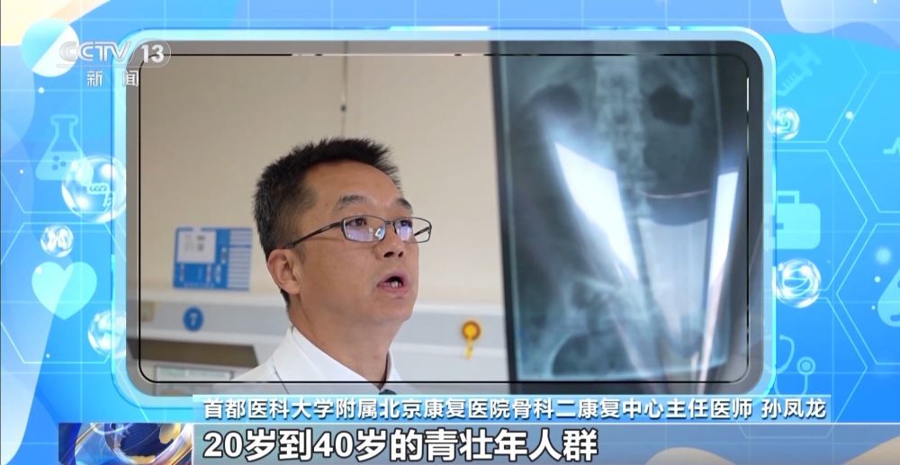 首都医科大学附属北京康复医院骨科二康复中心主任医师 孙凤龙:20岁到40岁的青壮年人群,特别容易出现脊柱的问题,就是腰椎间盘突出,流行病学的统计,大概是18%左右,也就是说接近于1/5。5个20岁到40岁的青壮年人里面就有一个人是得腰椎间盘突出的。