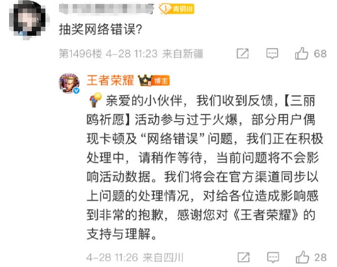 4月28日,有网友反映王者荣耀抽奖活动出现网络错误,引发热议。