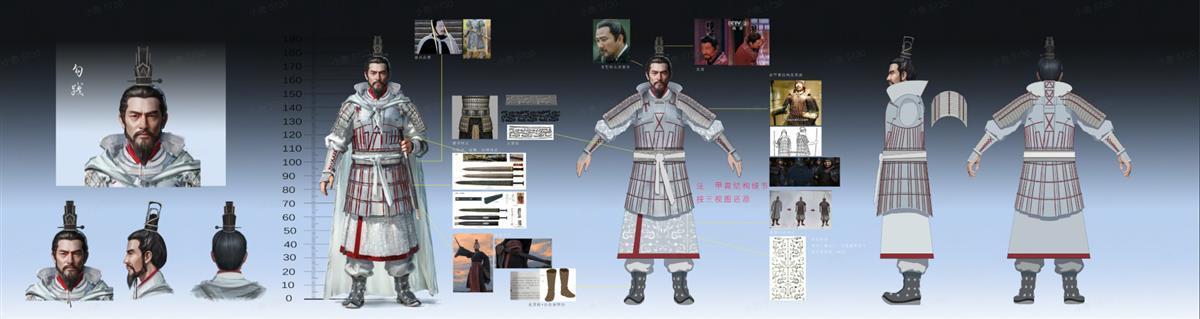勾践长啥样?大家都好奇。有意思的是,VR中也为勾践设计了具体的形象。其中勾践的盔甲和纹样,迭代了近30个版本。角色面部表情也经过了不断调整,呈现出如今坚毅的观感。