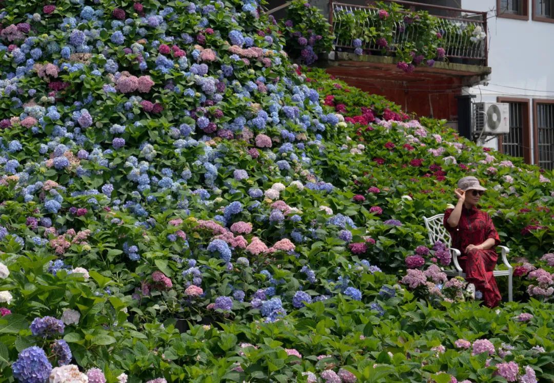 游人在上海市青浦区东厍村的绣球花“瀑布”置景前拍照打卡。新华社记者 刘颖 摄