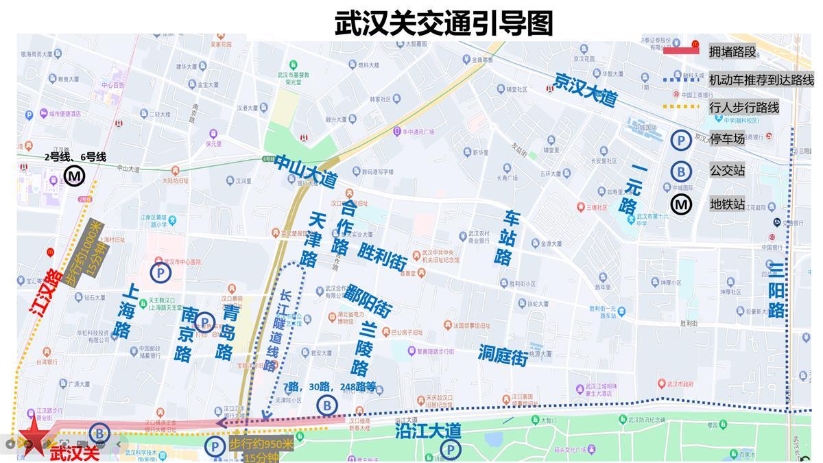 地铁出行:乘坐地铁二号线或六号线到江汉路站下车,沿江汉路步行10分钟至武汉关周边。
