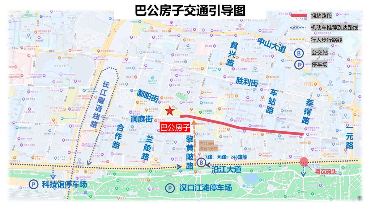 交通管制方面,兰陵路(中山大道至胜利街)11:00 - 19:00禁止通行;胜利街(兰陵路至黄兴路)11:00 - 19:00双向通行;沿江大道(兰陵路至黎黄陂路)中心护栏拆除,并用锥桶向南偏移一股车道。建议游客乘坐公共交通出行,自驾游客可将车辆停放至汉口江滩停车场,从兰陵门或洞庭门步行前往巴公房子。