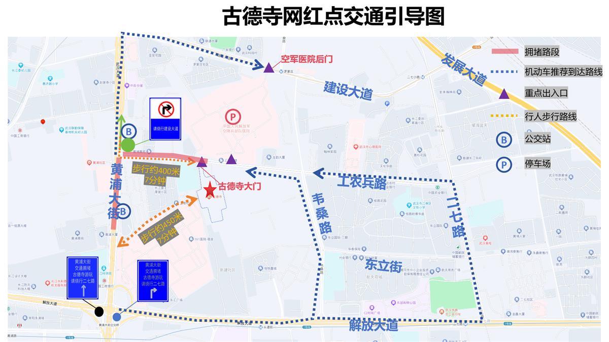 在高峰时段,为保障道路通行,江岸交警将实施临时管控措施,禁止车辆从黄浦大街驶入工农兵路,车辆可绕行建设大道、解放大道、二七路前往古德寺。自驾前往古德寺的游客,可在指定临时停放区泊车,需单排顺向有序停放,不得影响车辆及行人通行,其他道路临停车辆将依法处理。指定临时停放区域如下: