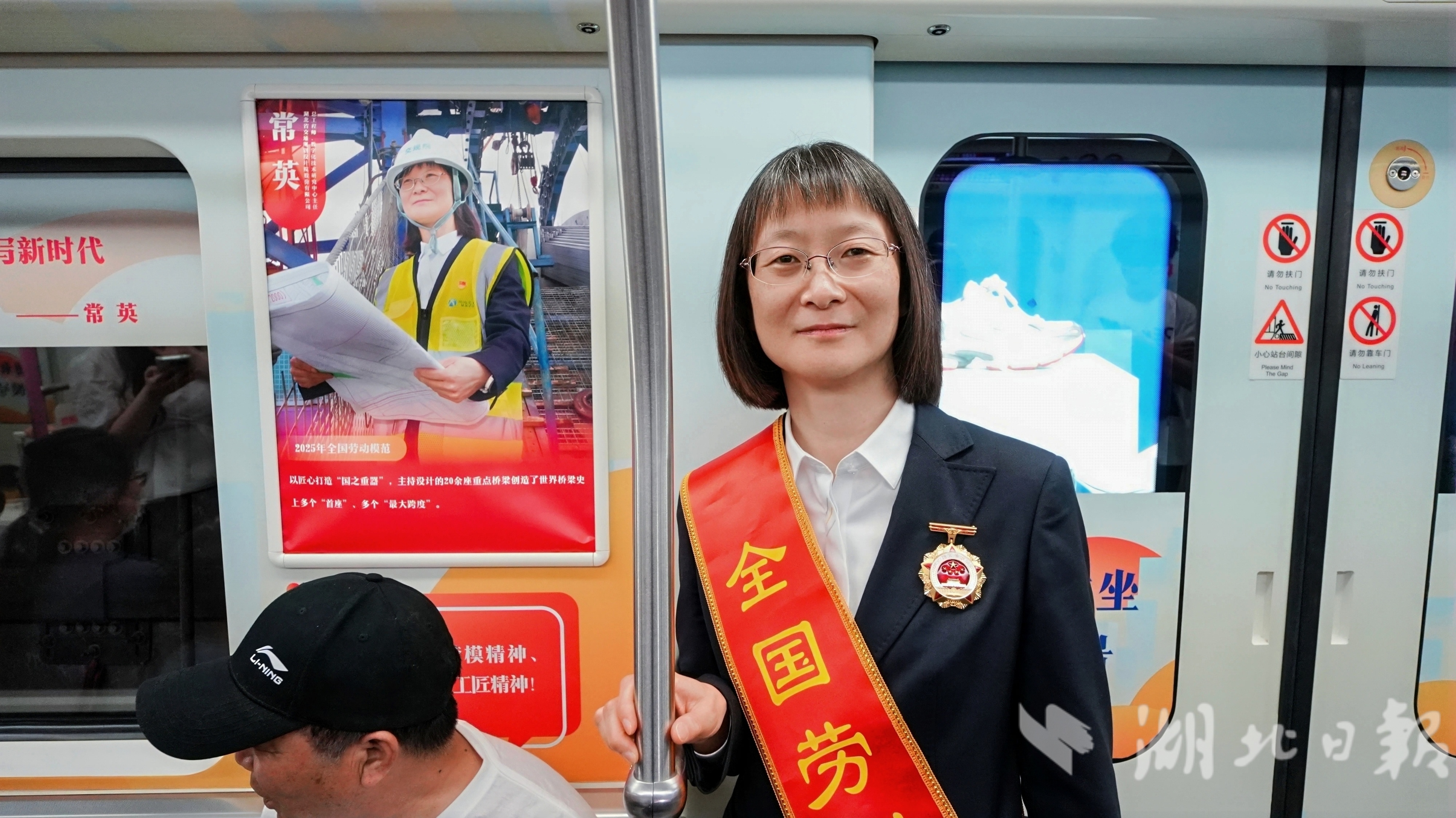 湖北日报讯(记者刘畅、实习生潘雅芳、通讯员肖娇、贺鹏、马莉莉)五一前夕,武汉轻轨1号线上,一辆绿皮“时光列车”呼啸而来,仿佛将人带进百年峥嵘岁月。换乘至地铁2号线“劳模号”专列,车厢瞬间被金色的荣誉光芒点亮,16位来自各行各业的劳模工匠代表的巨幅海报布满车厢,他们笑容满面、专注工作,风采动人。