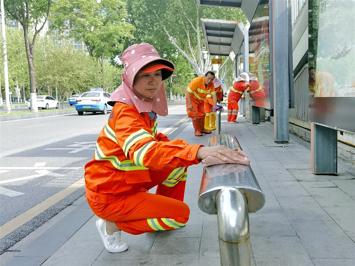 环卫工人擦洗公交站座椅 摄影:楚天都市报极目新闻记者卢成汉