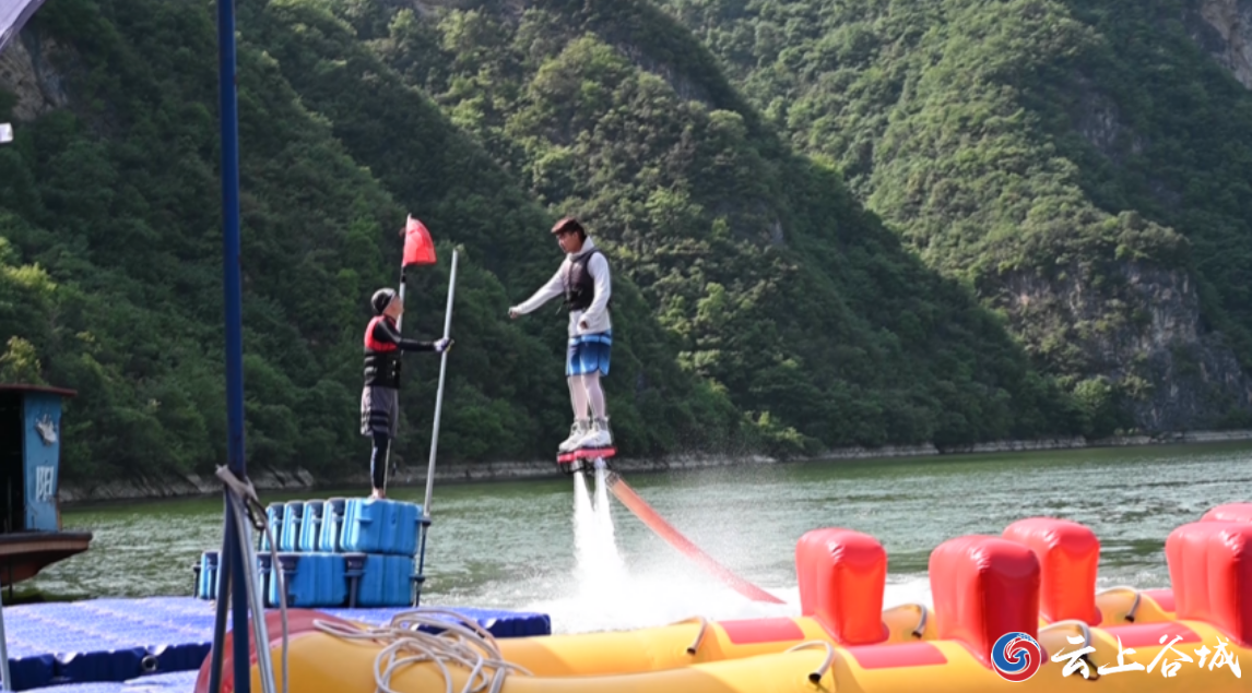 在一片开阔的水面上,游客在专业教练的保护下,从水面腾空而起,飞到将近20米的高空。伴随着喷水装置的反冲动力,专业教练带着游客完成水上漫步、高空翻腾等高难度动作,极具刺激性和观赏性的画面,引得岸上游客一阵惊叫和喝彩。在南河小三峡景区龙滩码头,景区新推出的水上游乐项目引来游客连连叫好。