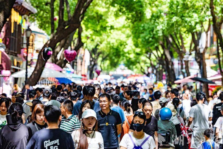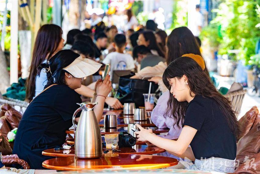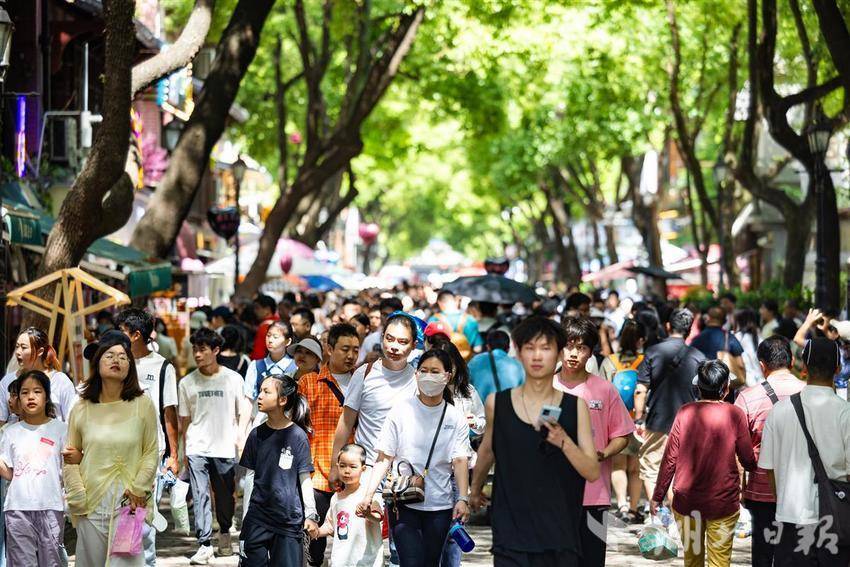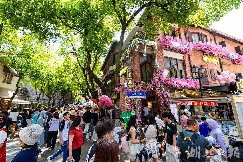 2025年5月2日,在武汉市江岸区汉口历史风貌区,大批游客穿行在黎黄陂路上,络绎不绝。黎黄陂路街道两侧保留着17处租界时代遗存的欧式建筑,包括汉口中共中央机关旧址、华俄道胜银行旧址、俄国巡捕房旧址等,见证了武汉乃至中国的近现代历史变迁。(湖北日报全媒记者 何宇欣 实习生 李昕蓉 摄)