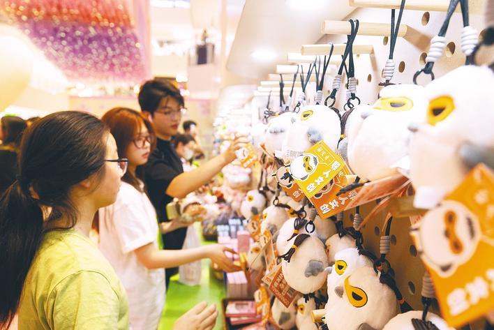5月2日,武汉亲橙万象汇武汉礼物快闪店,游客购买“邪完鸟”等武汉方言文创产品。(湖北日报全媒记者 薛婷 摄)