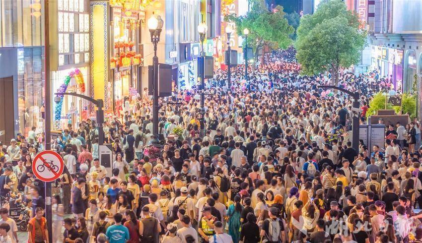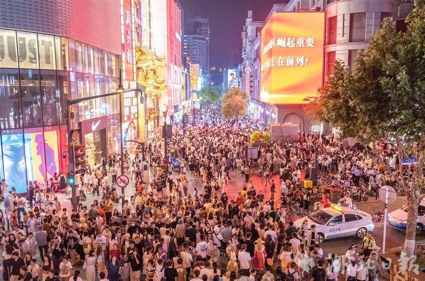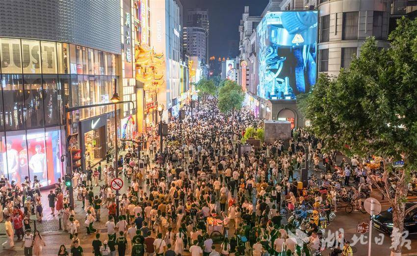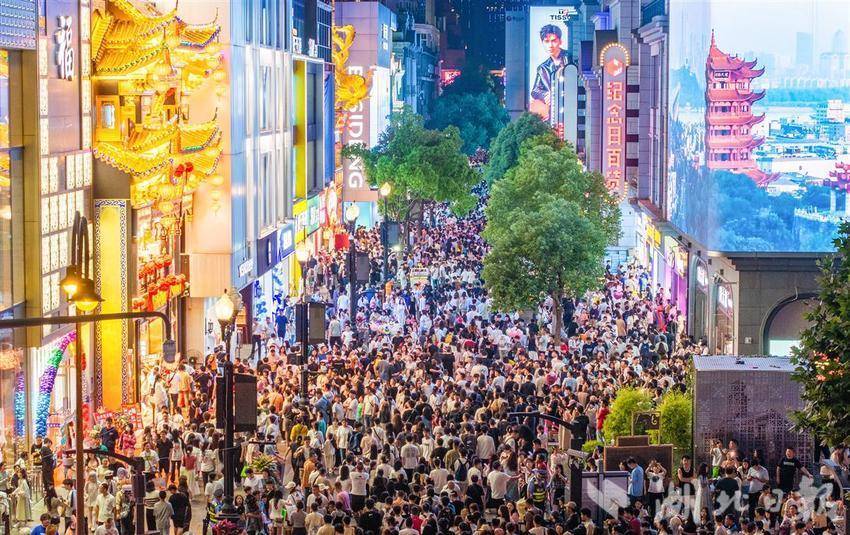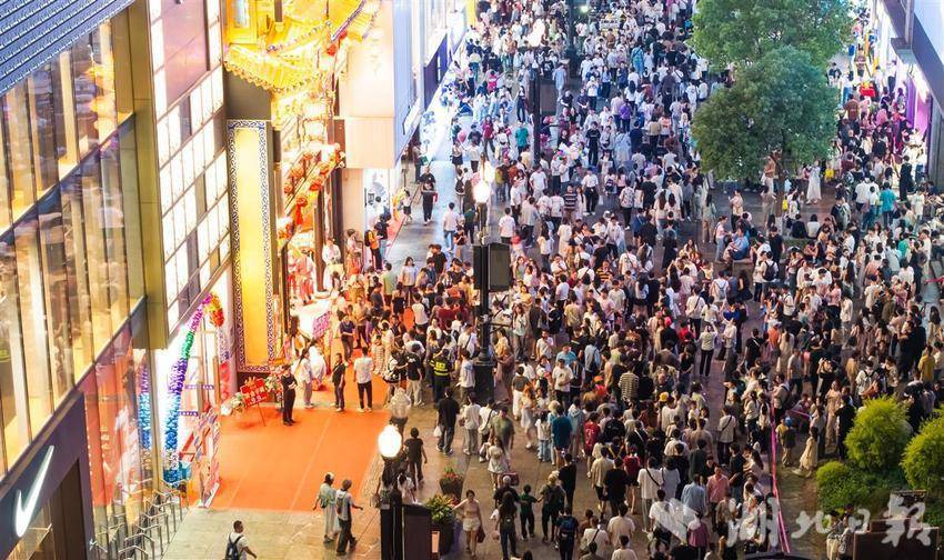 5月2日晚8时许,武汉江汉路步行街人流如织,来自全国各地的游客打卡武汉著名的百年商业老街。