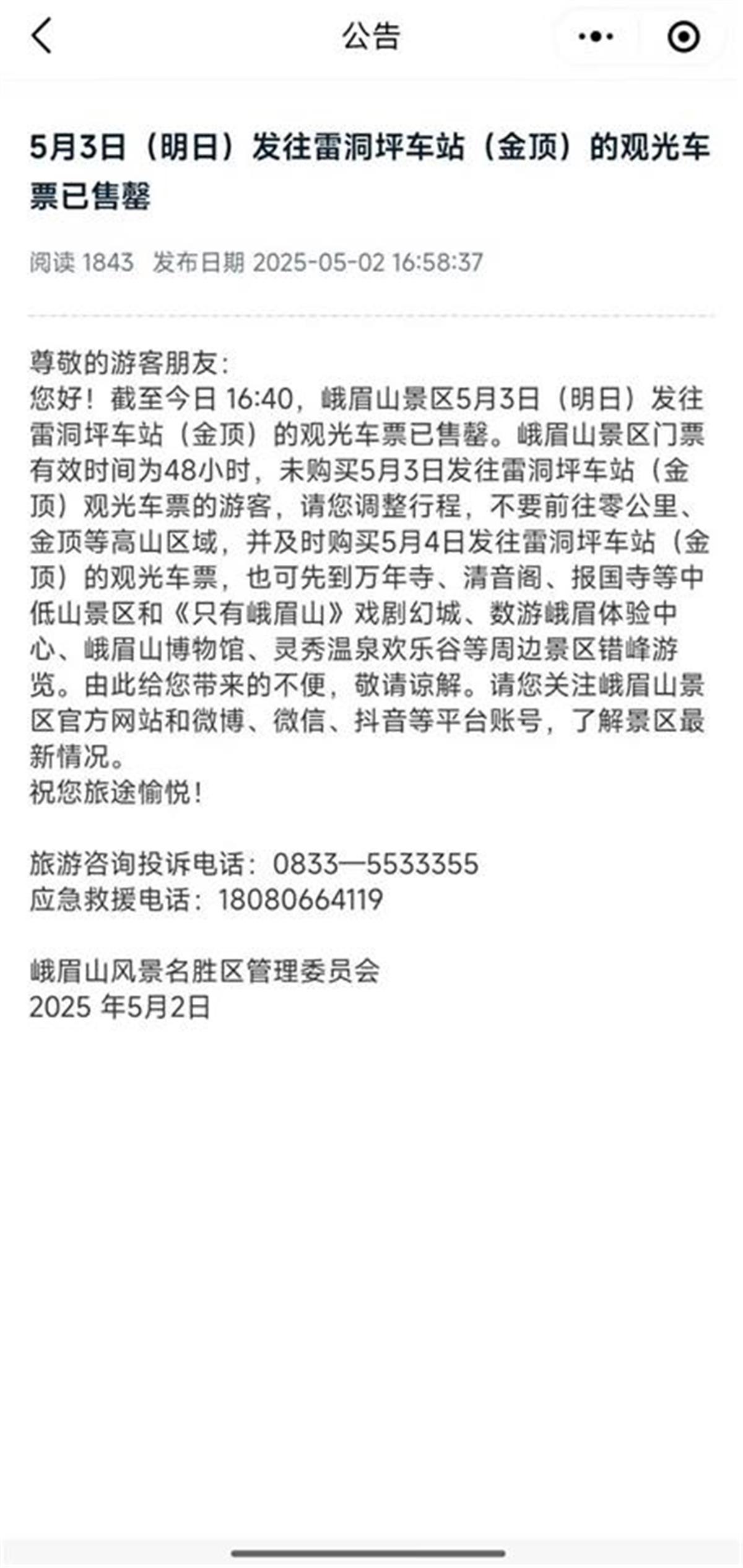5月2日门票售罄,5月3日发往雷洞坪车站(金顶)的观光车票也已提前一天售罄,景区提醒未购买发往雷洞坪车站(金顶)观光车票的,不要前往零公里、金顶等高山区域。