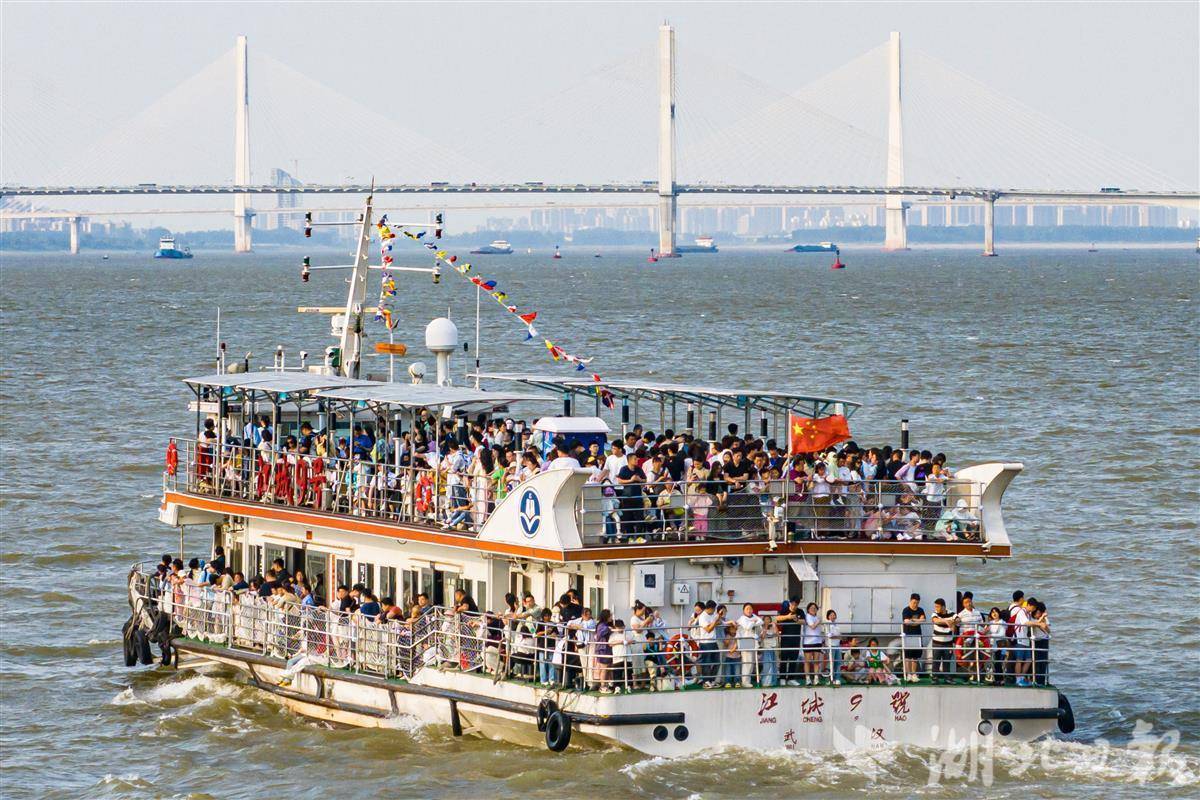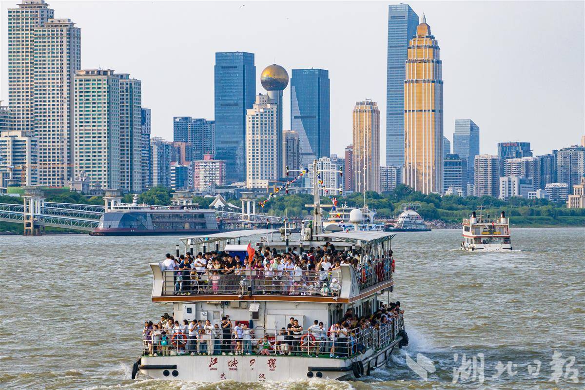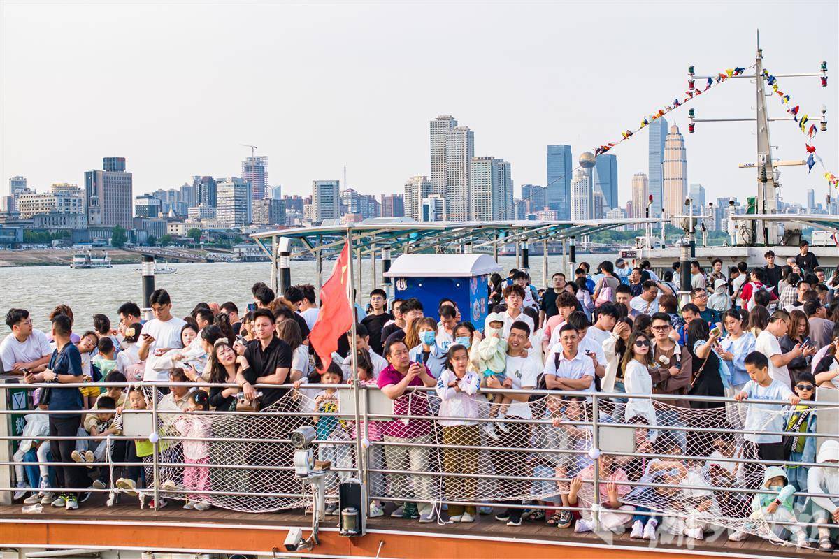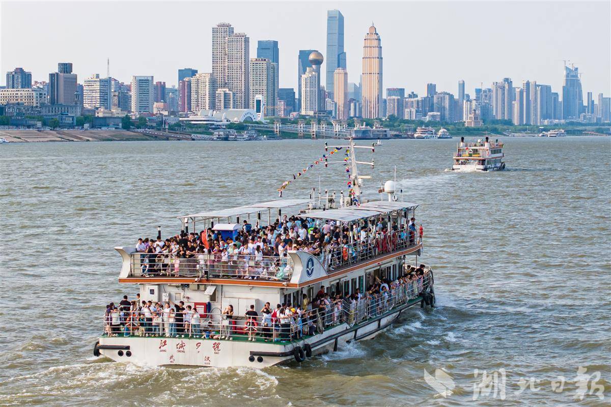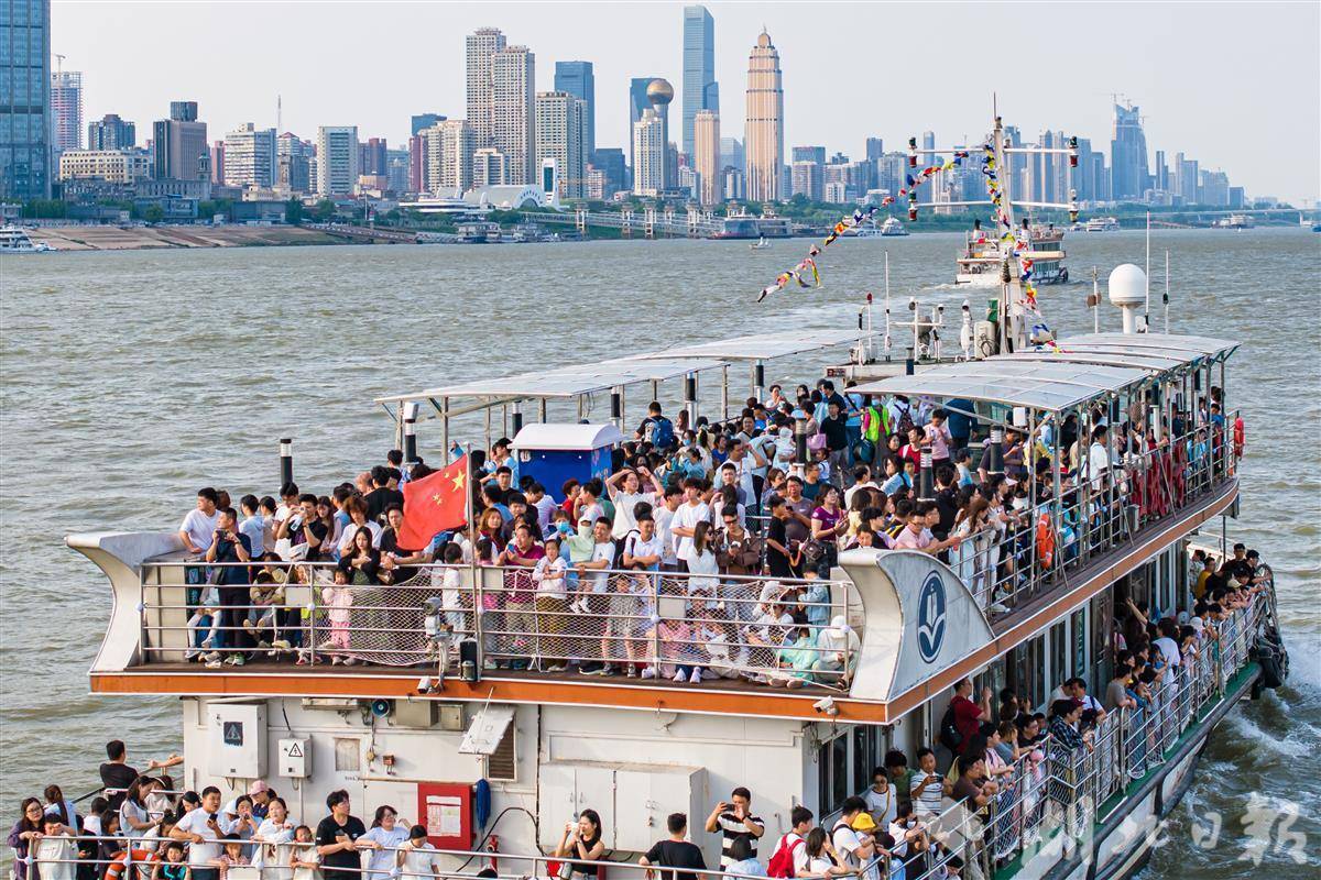 5月3日,“五一”假期第三日,武汉两江游览迎来客流高峰。大批游客选择乘坐游船游览江城,在甲板上饱览两江四岸美景。游船缓缓行驶在江面上,两岸现代都市景观与历史建筑交相辉映,游客们纷纷举起相机,记录下江城特有的水岸美景。(湖北日报全媒记者 任勇 摄)