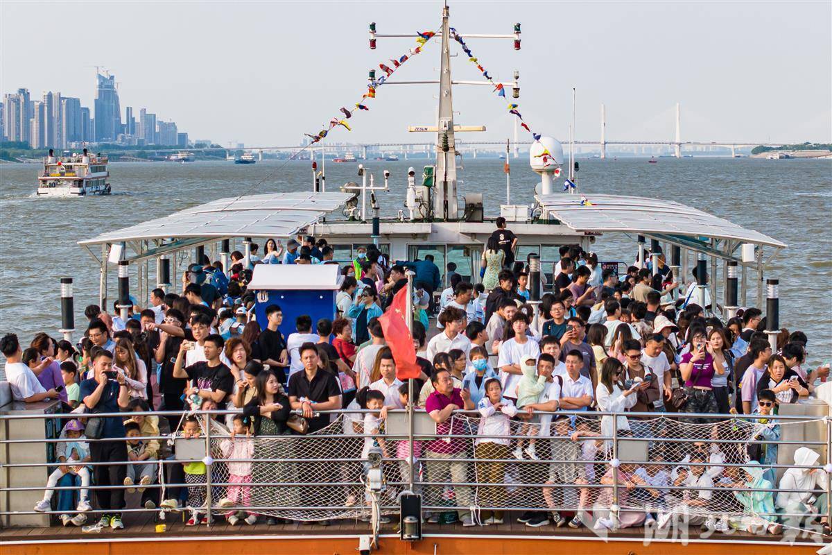 5月3日,“五一”假期第三日,武汉两江游览迎来客流高峰。大批游客选择乘坐游船游览江城,在甲板上饱览两江四岸美景。(湖北日报全媒记者 任勇 摄)