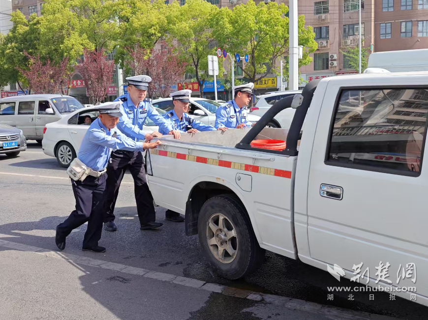 “王师傅,您打好方向盘,一二三推……”5月1日深圳大道,掇刀大队王新杰正带领队员化身“推车侠”,将一辆瘫痪在路中的小卡车,及时推行至路边。这位曾在李白杨中队淬炼过的中队长笑道:“我们是会移动的小白杨。”