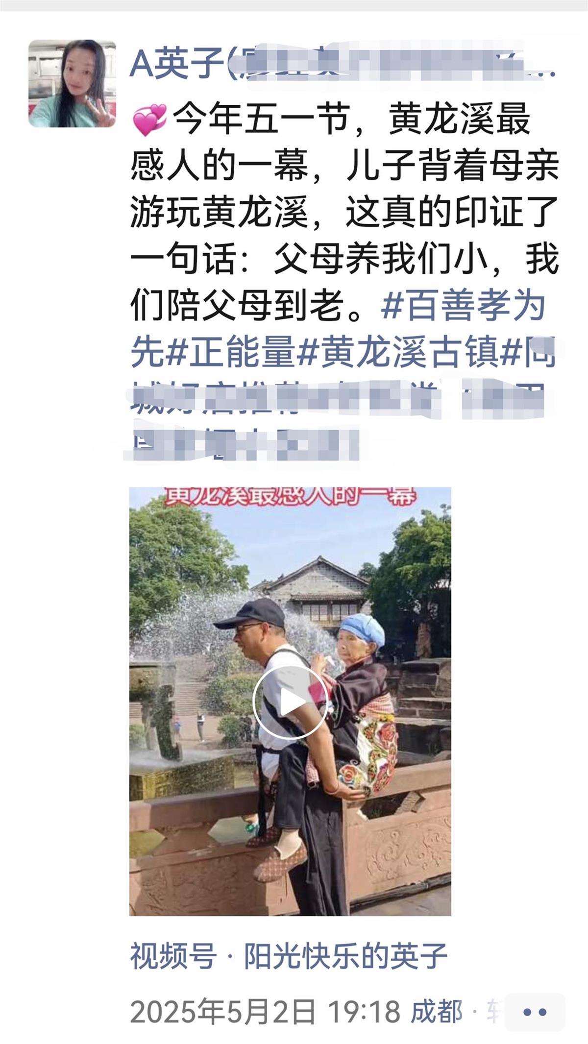 英子在朋友圈配文称:今年五一节,黄龙溪最感人的一幕,儿子背着母亲游玩黄龙溪,这真印证了一句话:父母养我们小,我们陪父母到老。