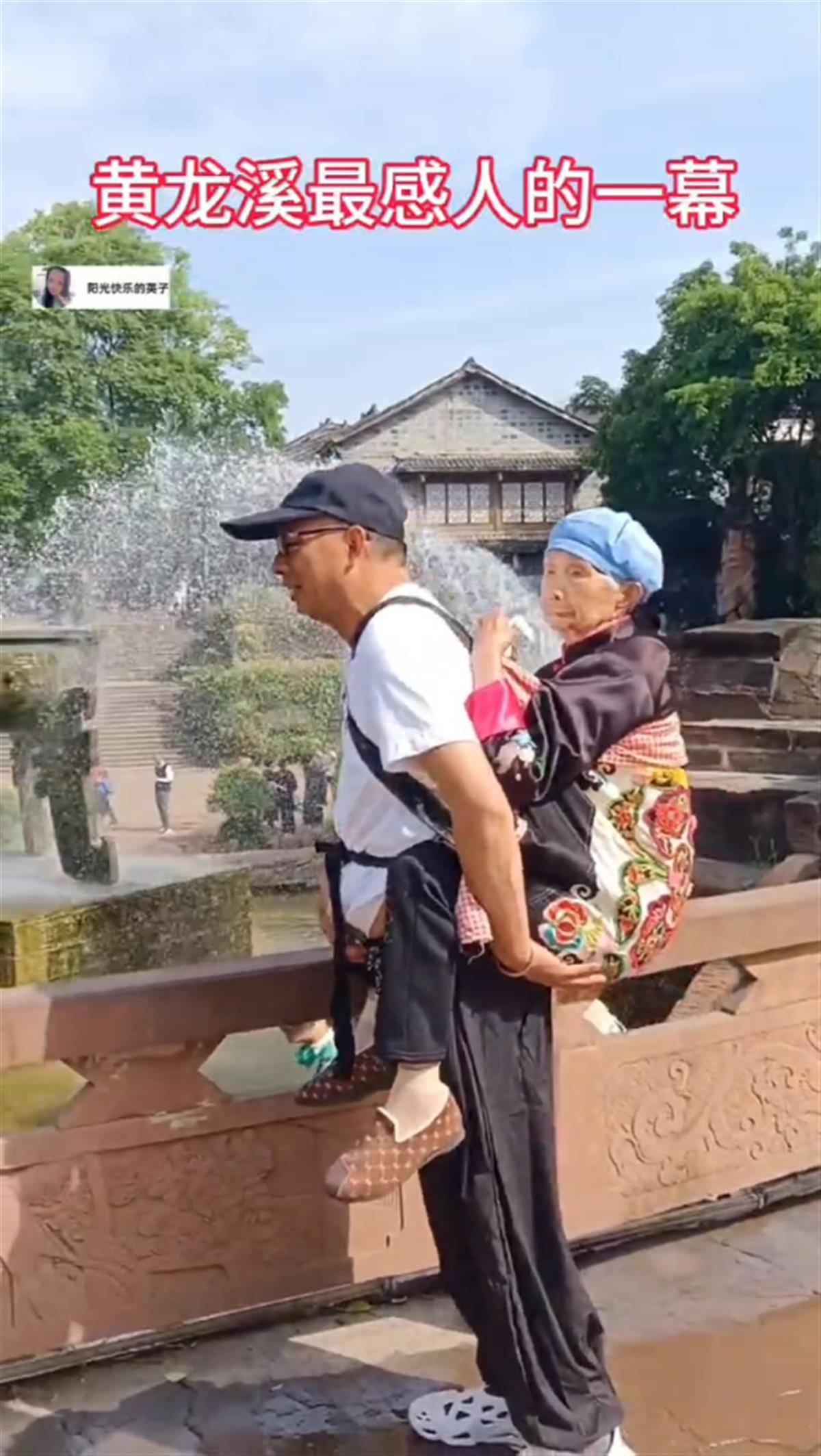 5月2日晚,视频号“阳光快乐的英子”发布了视频《黄龙溪最感人的一幕》,视频中一名身着白T恤,带着黑色棒球帽的眼镜大叔,背着瘦削的老母亲,在景区的一处广场游玩。