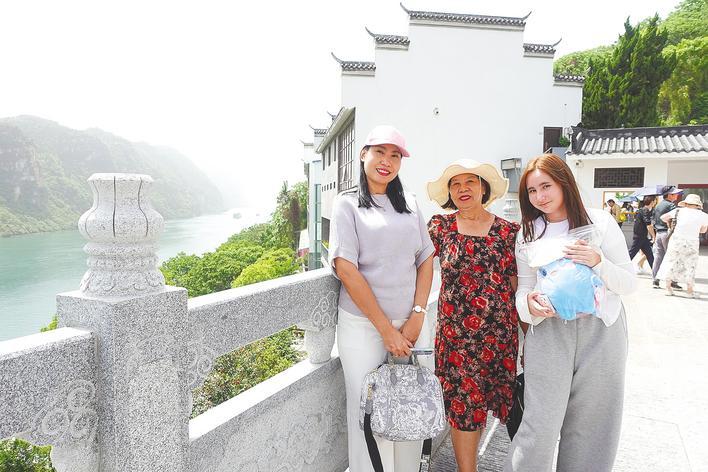 泰国女孩艾丽莎(右一)和母亲、奶奶来中国旅游,在宜昌西陵峡合影。 (湖北日报全媒记者 邓云 摄)