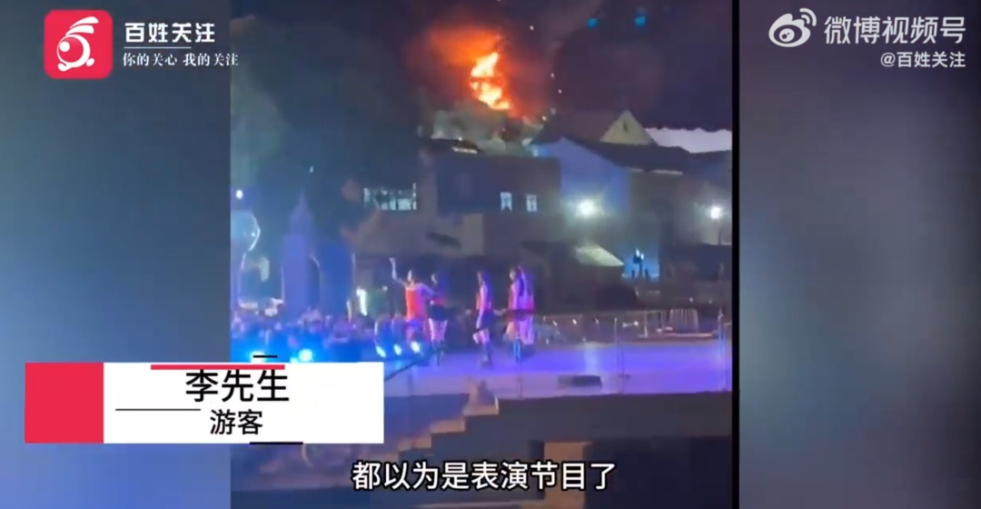 游客李先生告诉记者,失火的是一栋建筑外立面,疑似泡沫板外墙起火。最初以为是节目的表演效果,但火势蔓延迅速并且越烧越旺,才知晓是失火。景区工作人员立即进行火势干预,消防救援也赶到现场扑救。